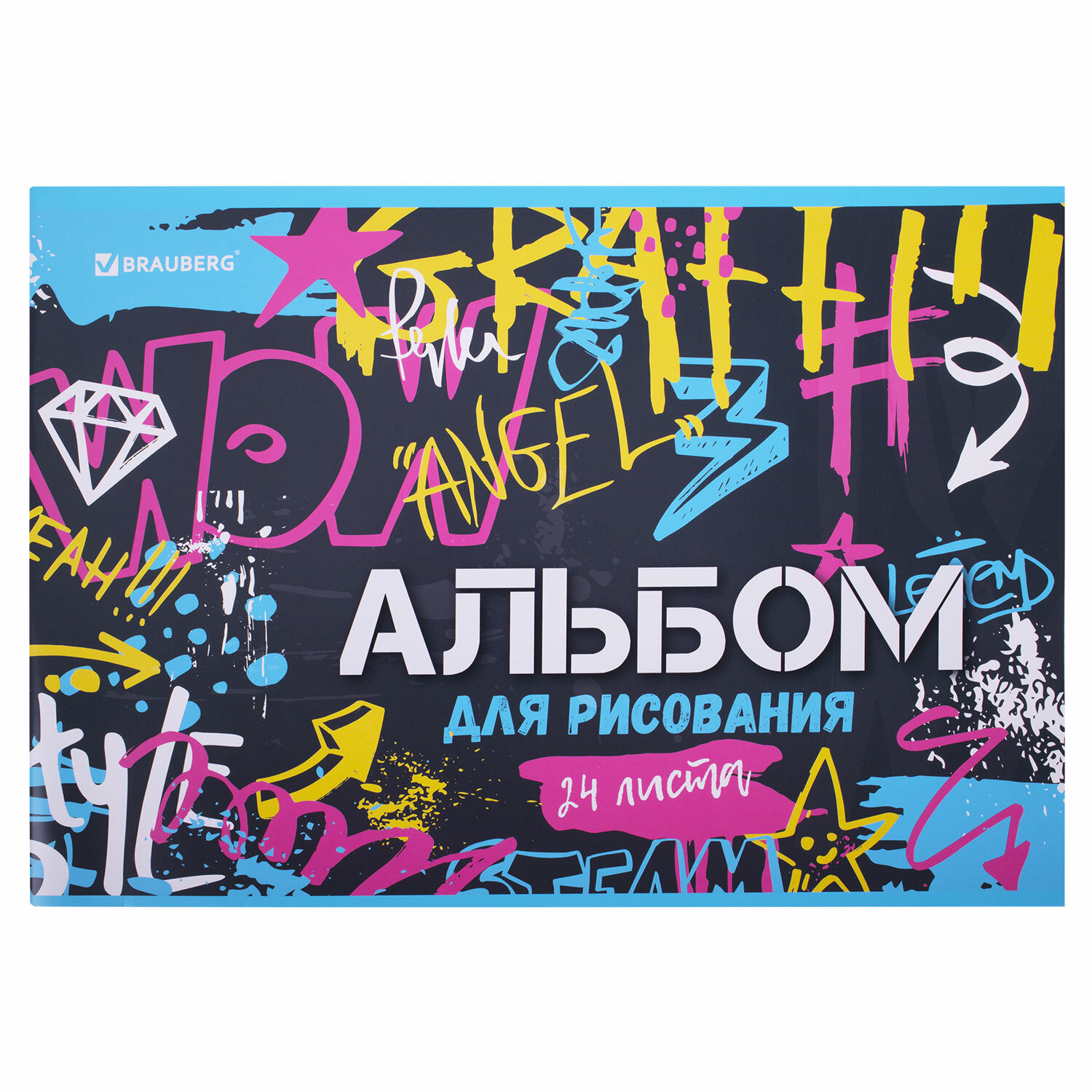 Содержит 24 листа плотностью 100 г/м2 формата А4 (203х288 мм). Красочная обложка выполнена из мелованного картона. Скрепление листов осуществляется с помощью скрепки. Подходит для смешанных техник рисования: красками, карандашами и фломастерами.