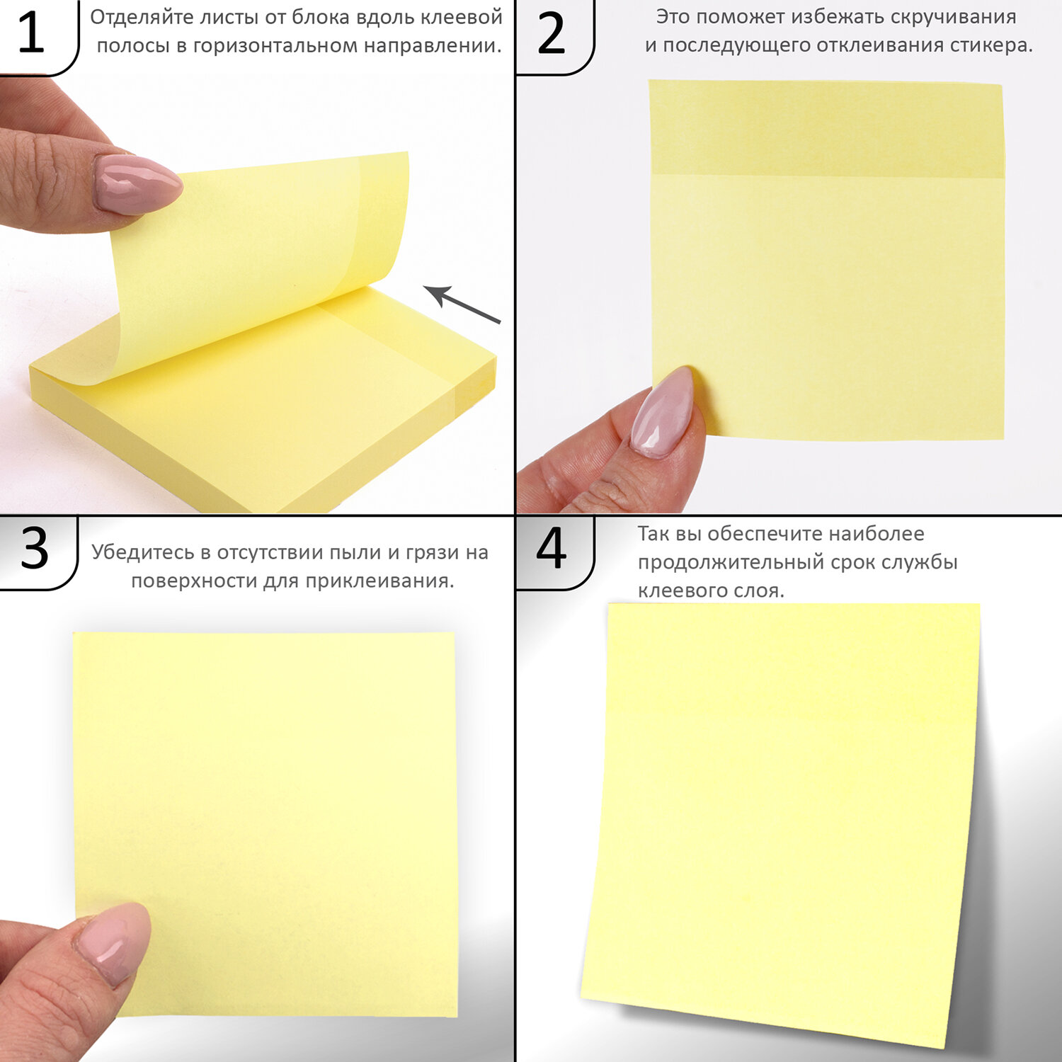 - отделяйте листы от блока вдоль клеевой полосы в горизонтальном направлении - это поможет избежать скручивания и последующего отклеивания стикера;