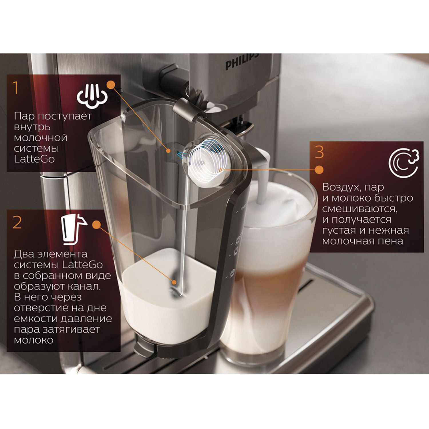 Система подачи молока LatteGo: капучинатор LatteGo на высокой скорости взбивает молоко в круглой камере, а затем подает нежную пену прямо в чашку без разбрызгивания и при оптимальной температуре.