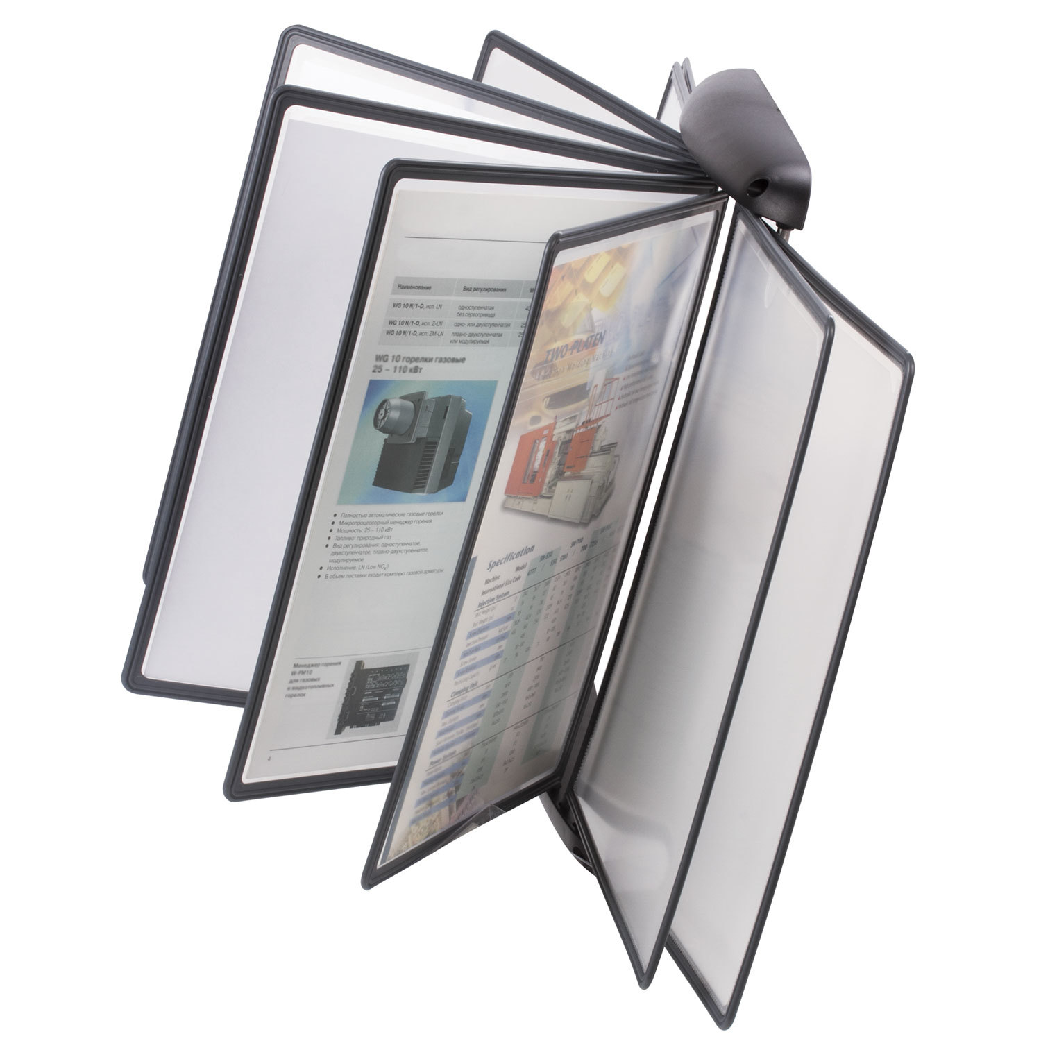 Размещение: настенное Формат панелей: А4 Макс. количество размещаемых панелей: 10 шт Количество панелей в комплекте: 10 шт Количество ярлычков-табуляторов в комплекте: 10 шт Антибликовая поверхность панелей: да Материал корпуса : пластик Материал панелей: пластик Высота конструкции: 38 см Ширина в раскрытом виде: 70 см Цвет корпуса: черный Цвет панелей: серый
