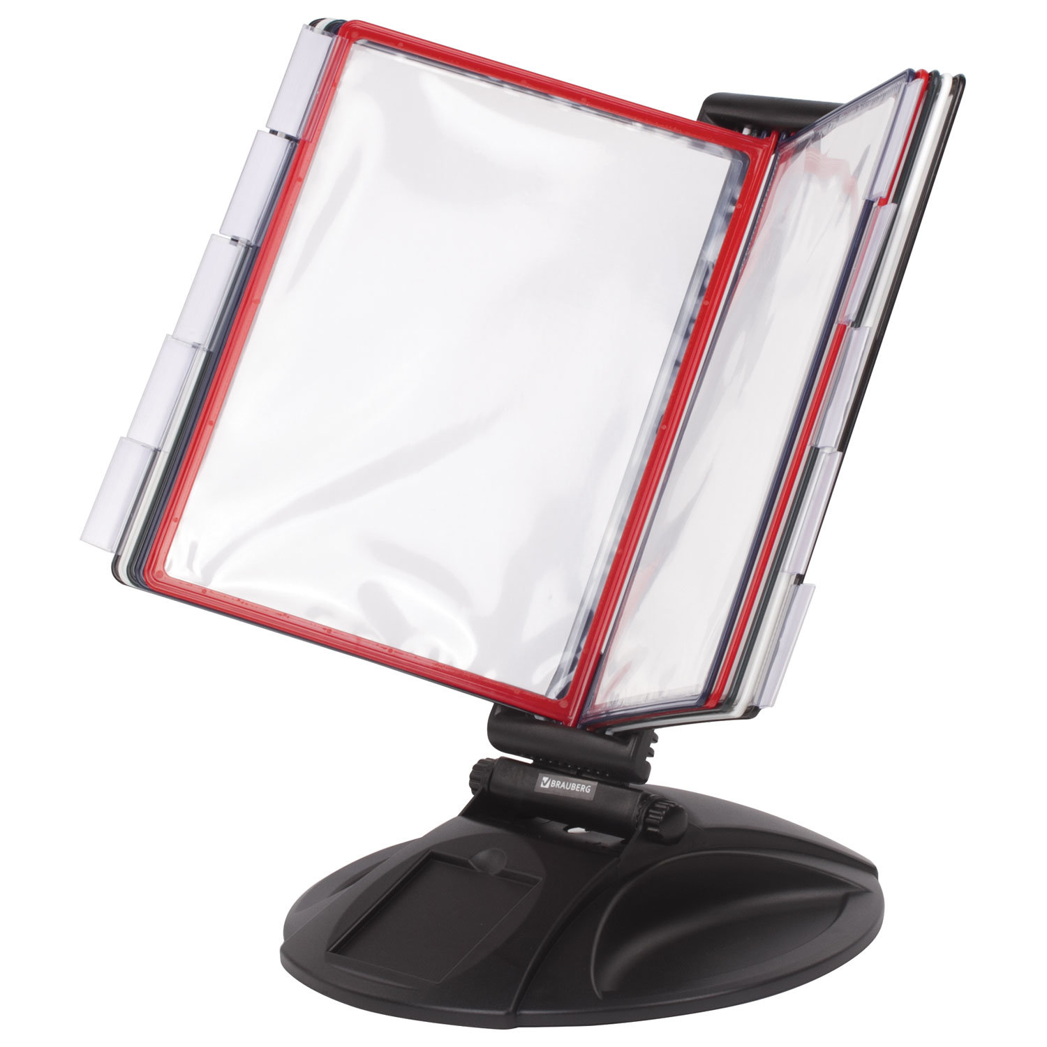 Размещение: настольное Формат панелей: А4 Макс. количество размещаемых панелей: 10 шт Количество панелей в комплекте: 10 шт Количество ярлычков-табуляторов в комплекте: 10 шт Регулируемый угол наклона дисплейного модуля: да Антибликовая поверхность панелей: да Материал корпуса : пластик Материал панелей: пластик Высота конструкции: 40.5 см Ширина в раскрытом виде: 49.3 см Цвет корпуса: черный Цвет панелей: ассорти