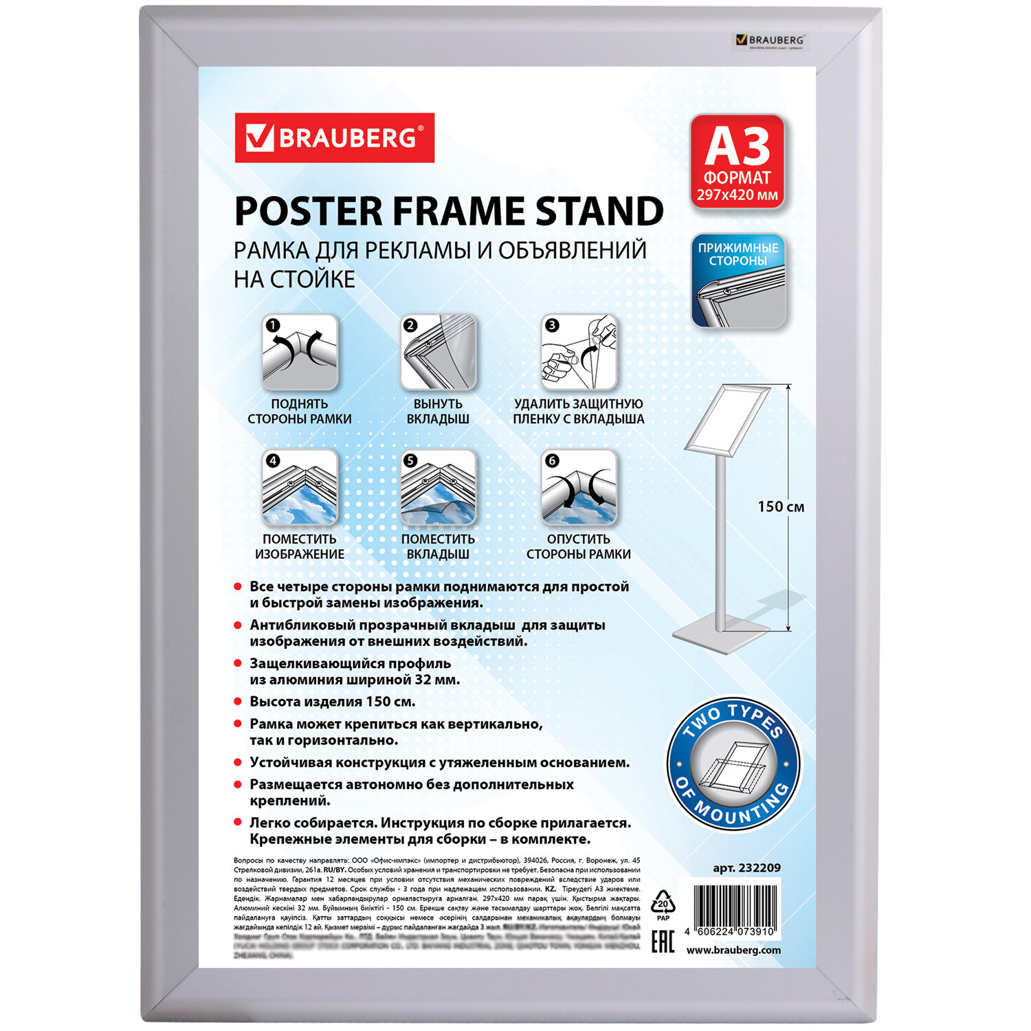 Размер листовки (ШхВ): А3 (297х420) Высота стойки: 1500 мм Материал стойки и рамки: алюминий Ширина профиля: 32 мм Вертикальное и горизонтальное крепление рамки: да Прижимные стороны: да Цвет: серебристый