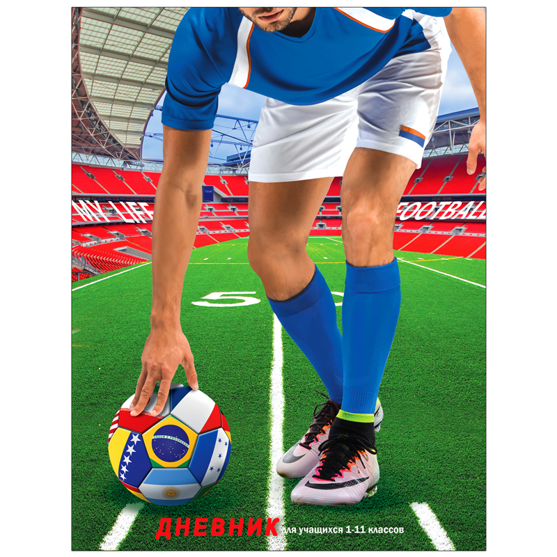Яркий дизайн дневника в футбольной тематике обязательно понравится мальчикам. Твёрдая обложка с прямыми уголками (7БЦ) выполнена из мелованного картона с глянцевой ламинацией. Дневник содержит 4 страницы для персонализации данных.