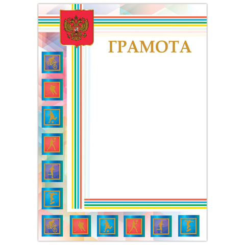 Заголовок: "Грамота" Назначение: спортивная Формат: А4 Материал: импортный мелованный картон Плотность: 200 г/м2 Изображение российской символики: да Оформление надписи: без спецэффектов