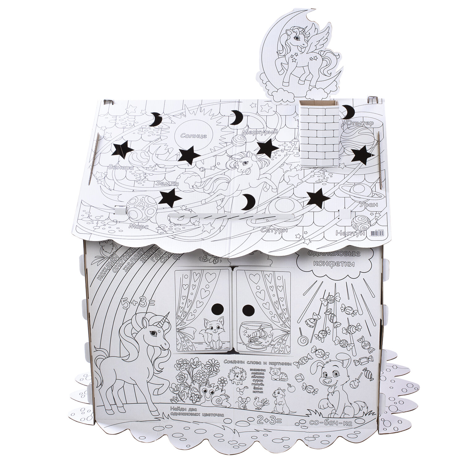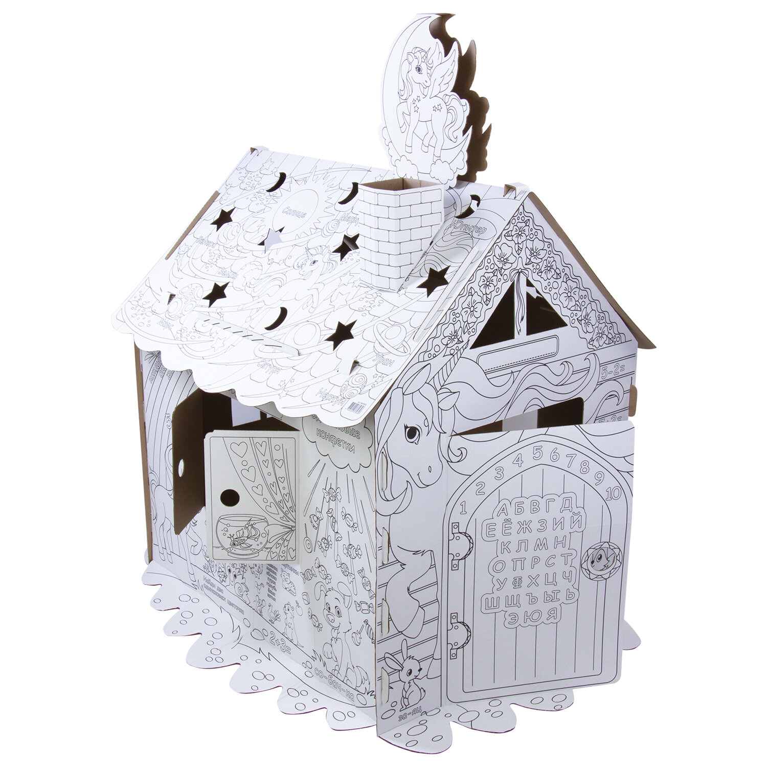 Домик-раскраска изготовлен из 100% безопасного, экологически чистого материала - гофрированного картона. Состоит из 7 деталей: 4-х стен, крыши, трубы и флюгера, которые очень просто собираются и крепятся между собой без клея и ножниц. Все стороны домика разные по дизайну, толстый контур у рисунков поможет малышу аккуратно их раскрасить любыми фломастерами, красками, карандашами, восковыми мелками. Полянка вокруг домика не даст испачкать ковер или пол красками. Все края домика имеют закругленную форму и безопасны для ребенка.