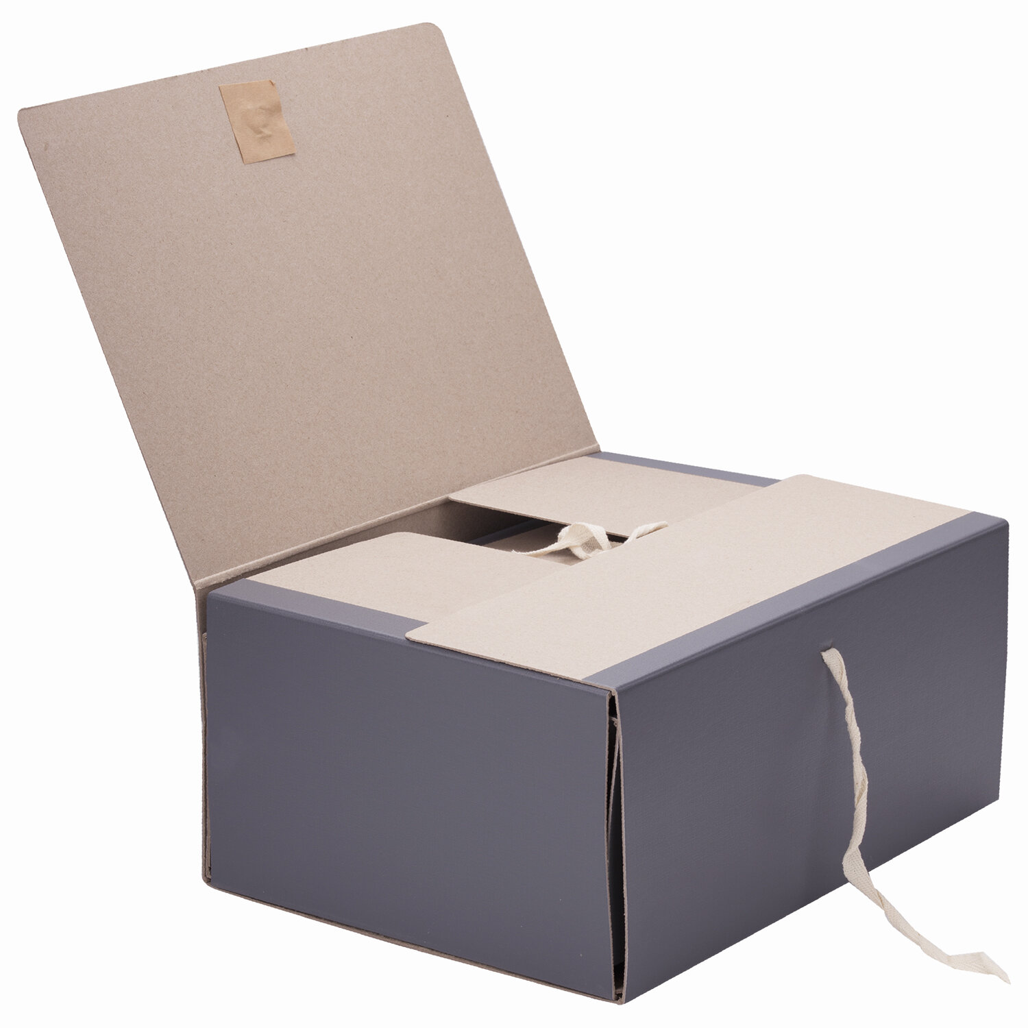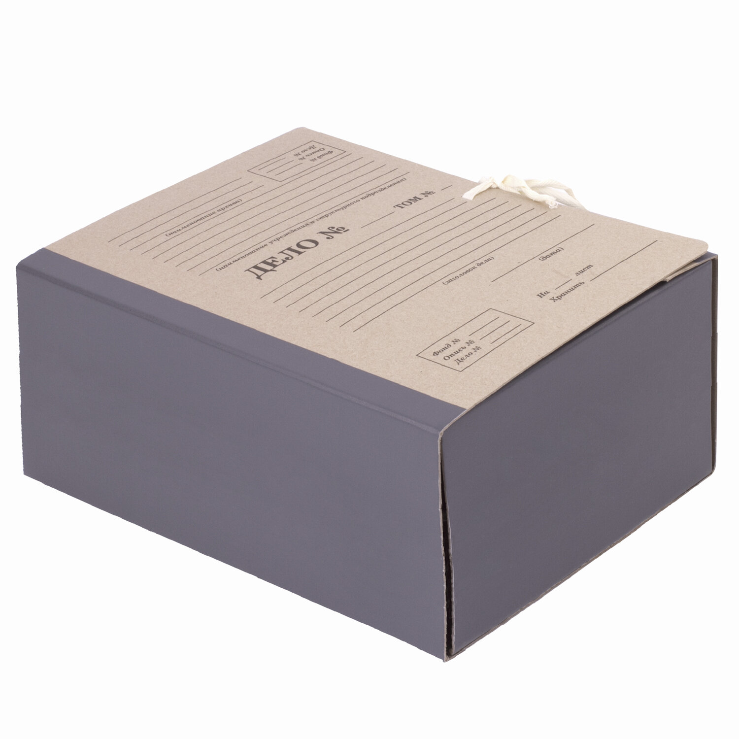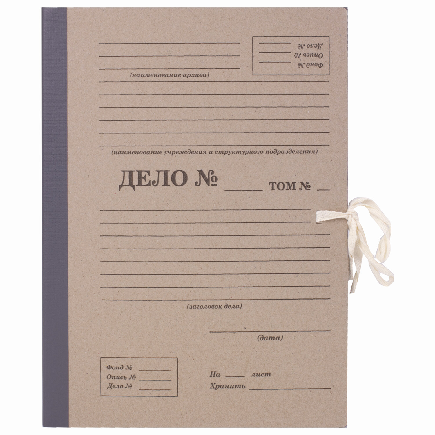 Папка стандартного формата А4 вмещает до 1500 листов. Изготовлена из переплетного картона с покрытием из бумвинила. Ширина корешка составляет 150 мм. На лицевой стороне есть поля для подписывания. Закрывается с помощью 4-х тканевых завязок.