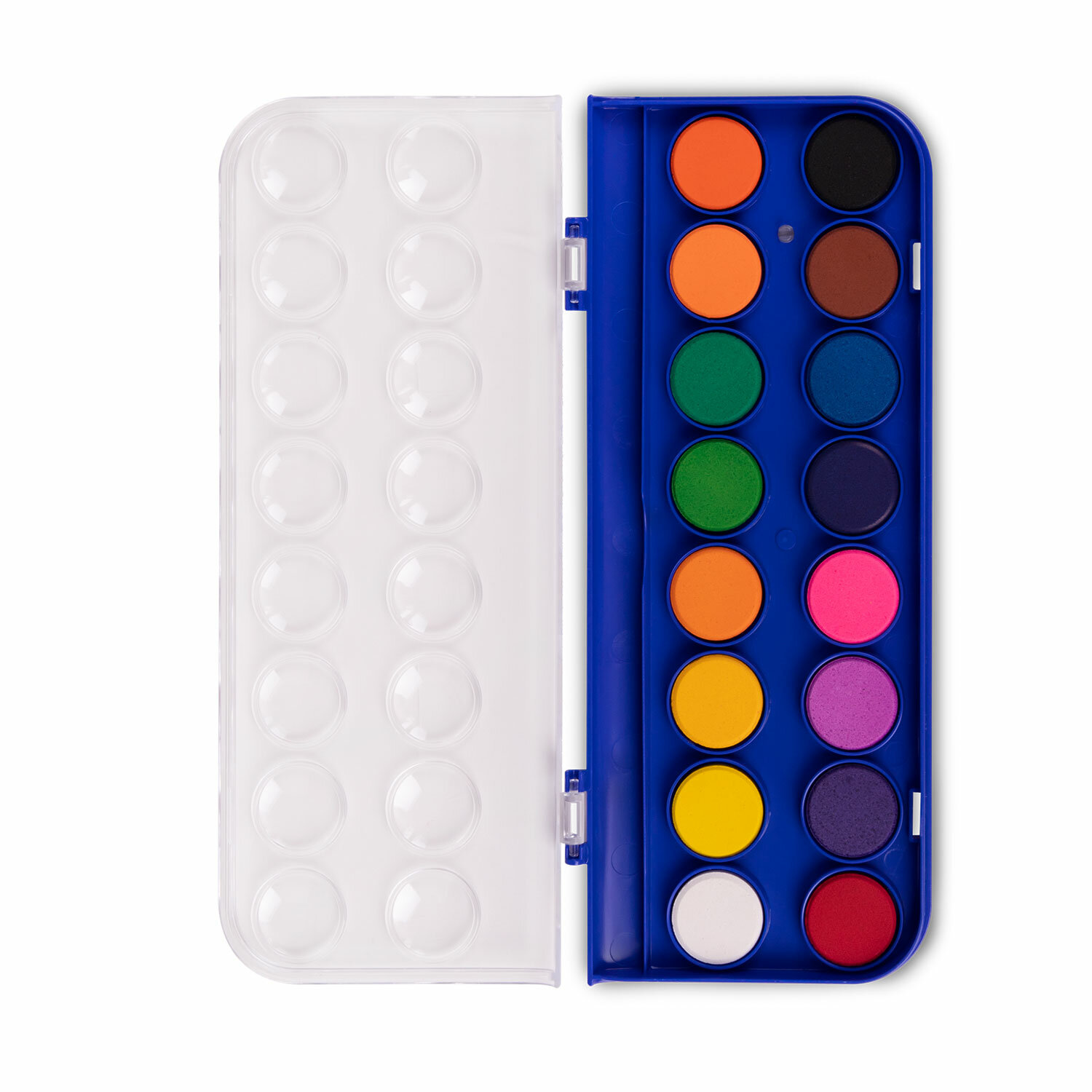 В наборе 16 насыщенных цветов, которые отлично смешиваются, позволяя создавать множество оттенков. Краски легко наносятся, образуя интенсивное яркое покрытие даже при нанесении в один слой. Обеспечивают однородное окрашивание, быстро высыхают и не портятся со временем. Краски безопасны для детей, нетоксичны. Выпускаются в пластиковом пенале с европодвесом, прозрачной крышкой, круглой формой кювет и отделением для кисточки. Съемную пластиковую крышку можно использовать в качестве палитры для смешивания красок.