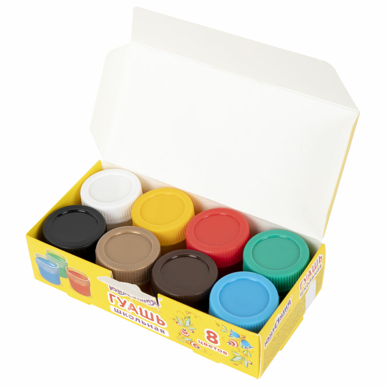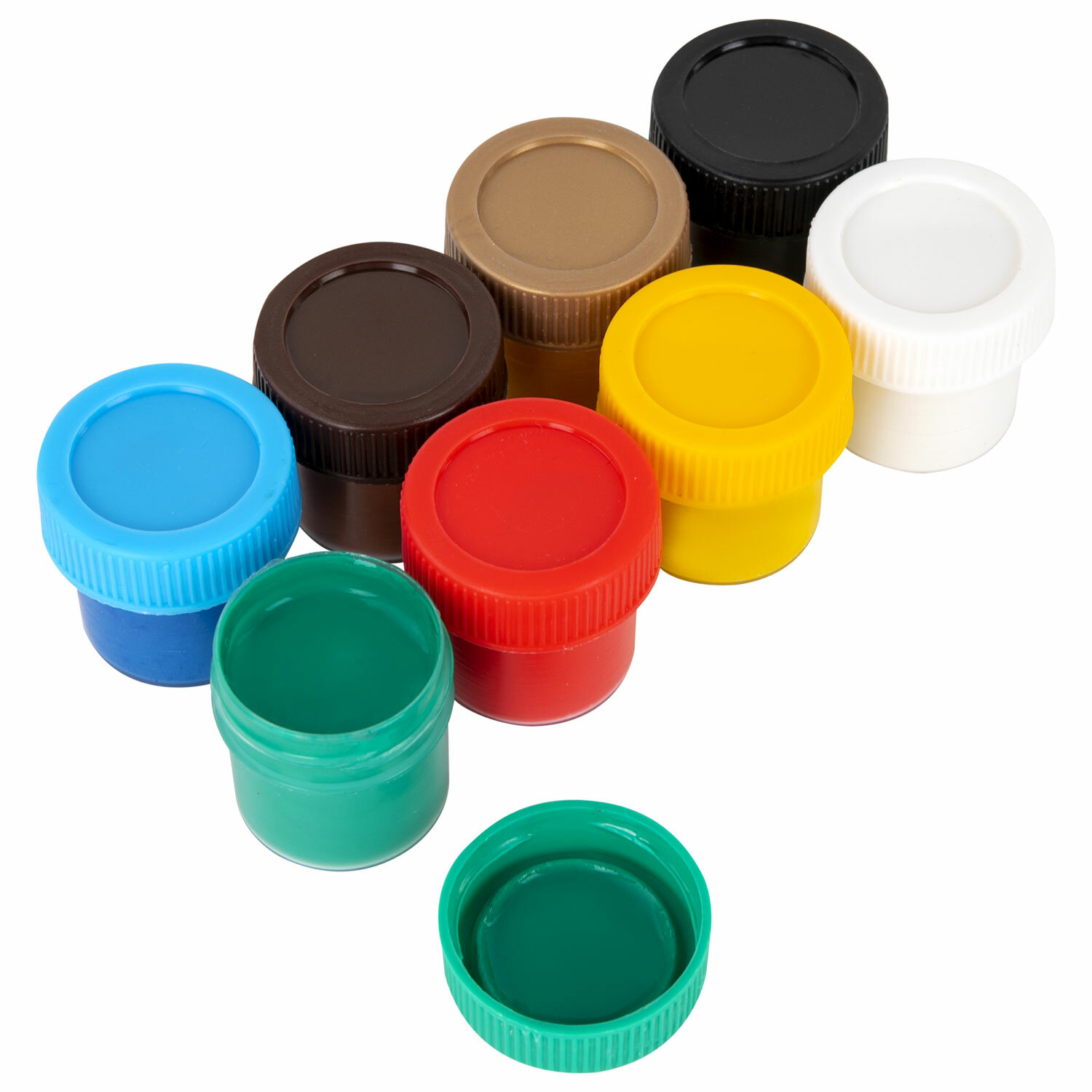 8 ярких сочных цветов красок полностью безопасны в использовании, не токсичны и не имеют резкого запаха. Гуашь обладает высокой светостойкостью и укрывистостью, легко размывается водой, хорошо наносится, без труда удаляется с рук и одежды. Краска находится в пластмассовой герметичной баночке, объем которой равен 17,5 мл. Общий объем - 140 мл.
