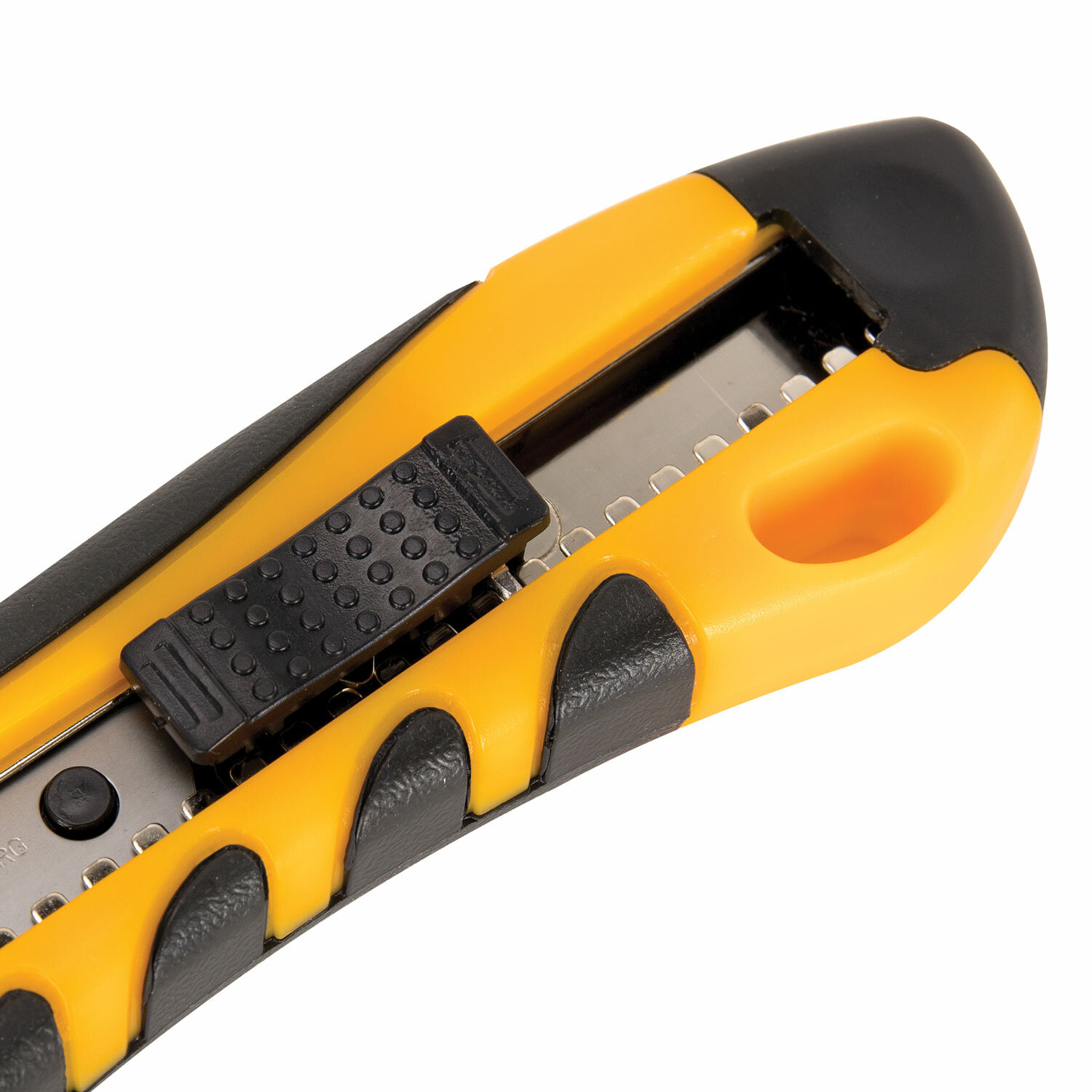 Нож имеет 3 лезвия шириной 18 мм, что обеспечивает быструю резку. Благодаря удобной ручке с резиновыми вставками обеспечивается комфорт и безопасность. Предусмотрен автофиксатор, при помощи системы блокировки лезвия предотвращающий его сдвиг в процессе работы. В пластиковом корпусе предусмотрено отверстие для подвеса, что позволяет удобно хранить принадлежность. Нож отличается эргономичностью и практичностью, подходит для офисного и домашнего использования. Поставляется в нескольких вариантах цвета (без возможности выбора).