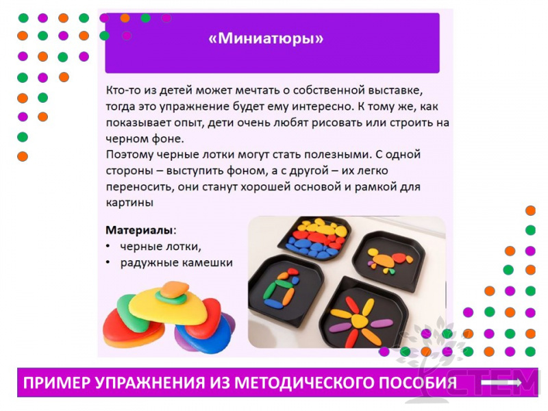 7. Пособия помогают расширить представление педагогов о понятии «творчество» и развитии творческих способностей у детей через многообразие форм и приемов взаимодействия с материалами, а также нестандартности самих пособий, их «открытости», многофункциональности.