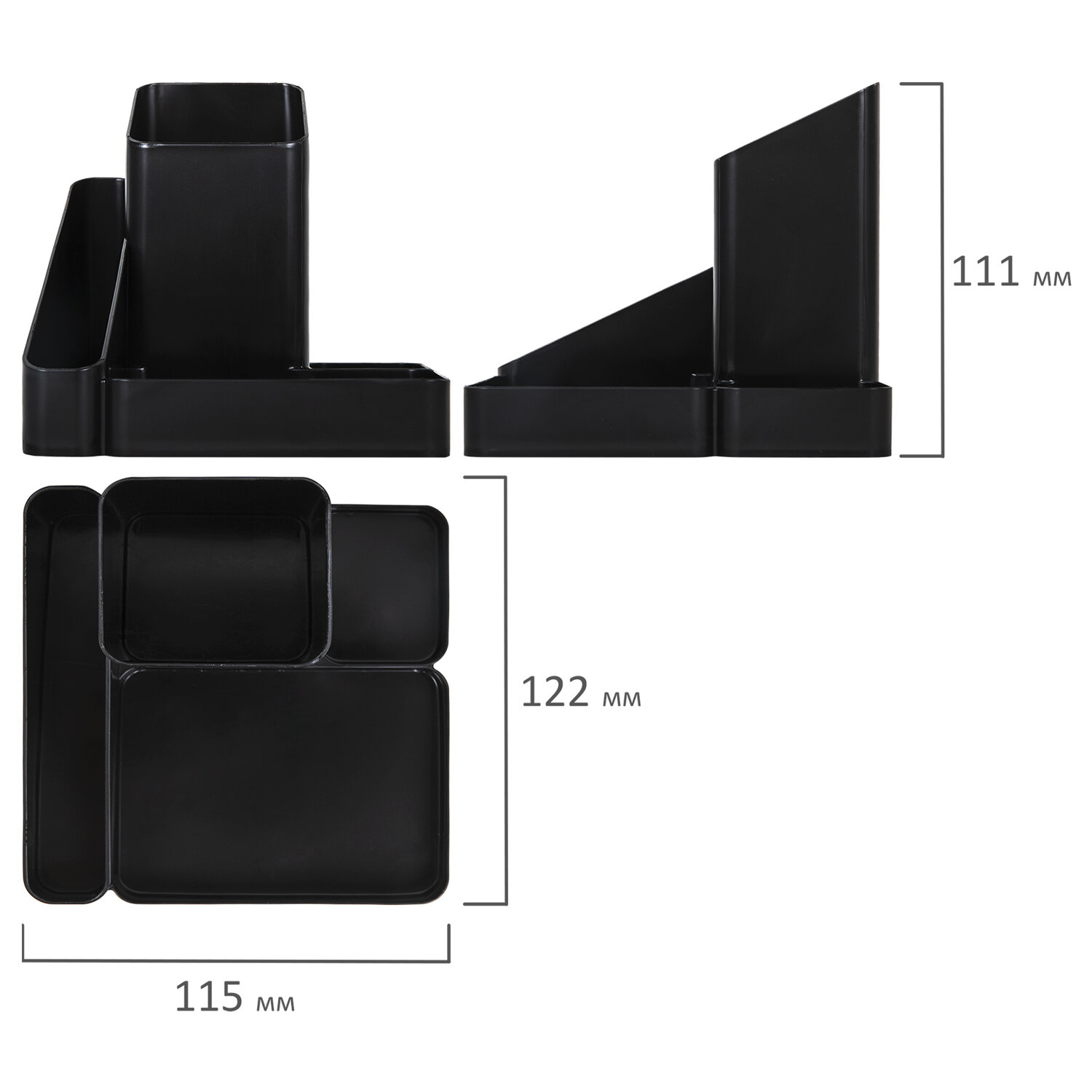 Изготовлена из высококачественного пластика. Имеет размеры 115х122х111 мм. Состоит из 4-х отделений для канцелярских мелочей и пишущих принадлежностей. Поставляется без наполнения.
