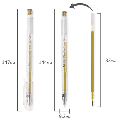 Имеет шестигранный прозрачный корпус с рифленой поверхностью в зоне захвата. Детали ручки выполнены в цвет золотистых чернил. Сменный стержень длиной 130 мм со стандартным наконечником позволит использовать ручку максимально долго. Диаметр пишущего узла, равный 0,5 мм, создает линию письма, равную 0,35 мм.