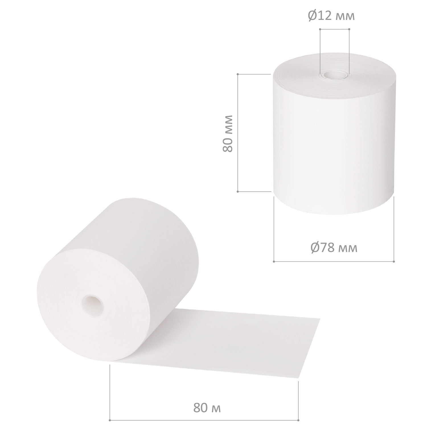 Ширина рулона: 80 мм Диаметр рулона: 78 мм Длина намотки: 80 м Диаметр втулки: 12 мм Плотность бумаги: 55 г/м2 Термослой: наружу Наличие сигнальной полосы: да Цвет печати: черный Количество в комплекте: 6 шт Упаковка: термоусадочная пленка