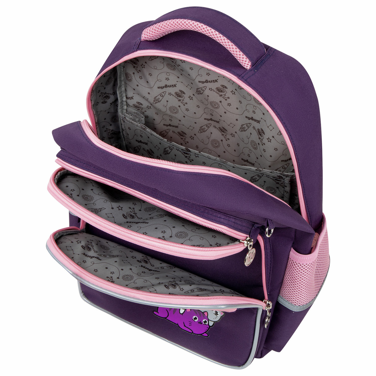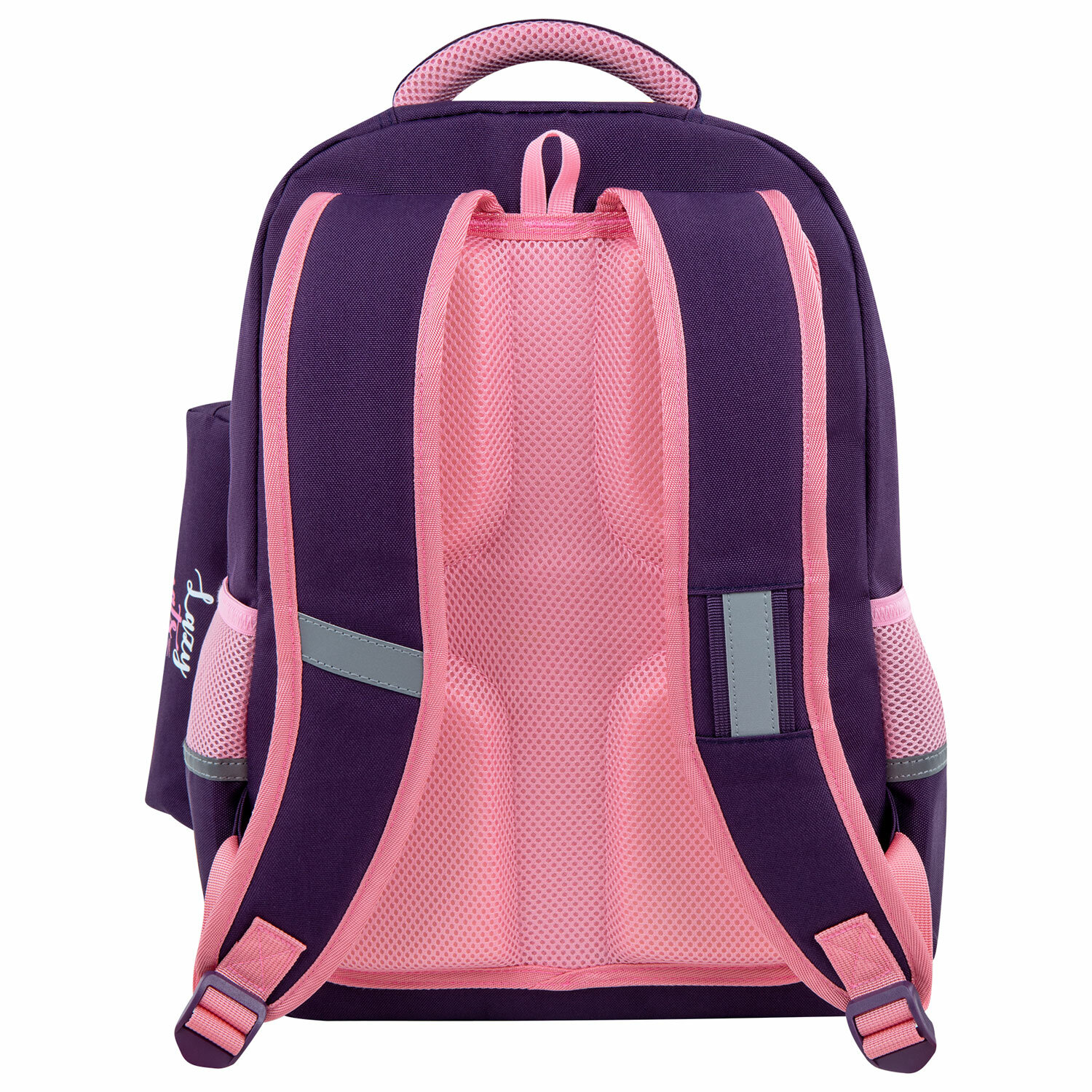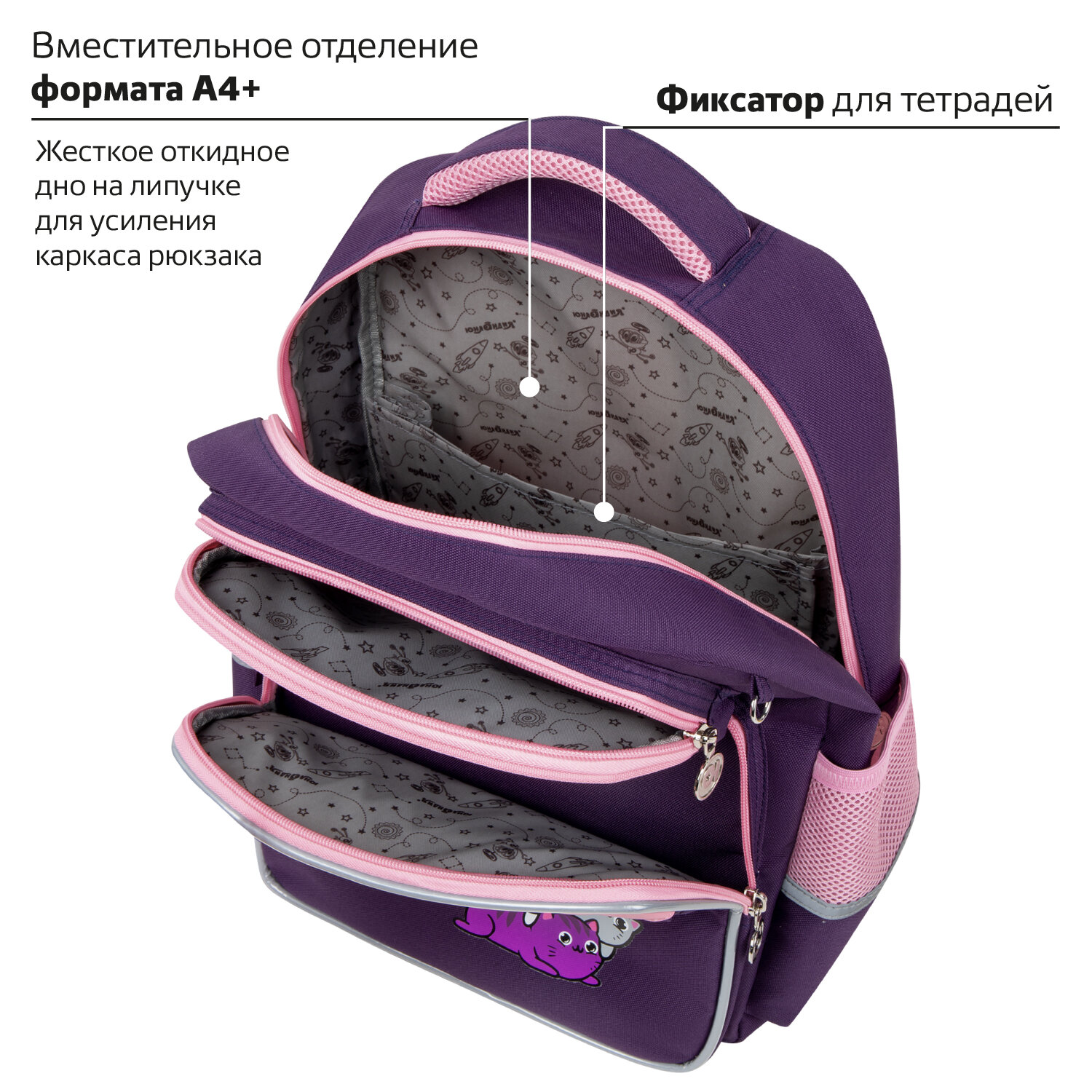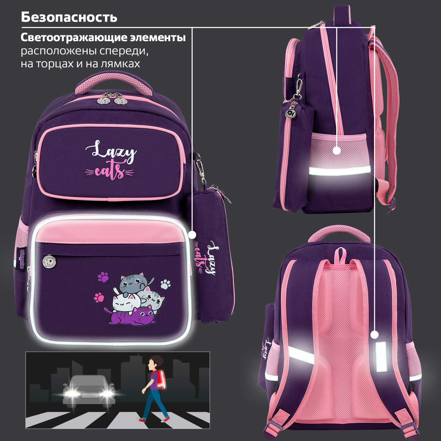 Рюкзак снабжен усиленной ручкой из ткани и петелькой для подвешивания на крючок, а также фиксатором для тетрадей. Светоотражающие элементы с четырех сторон обеспечивают безопасность в темное время суток.