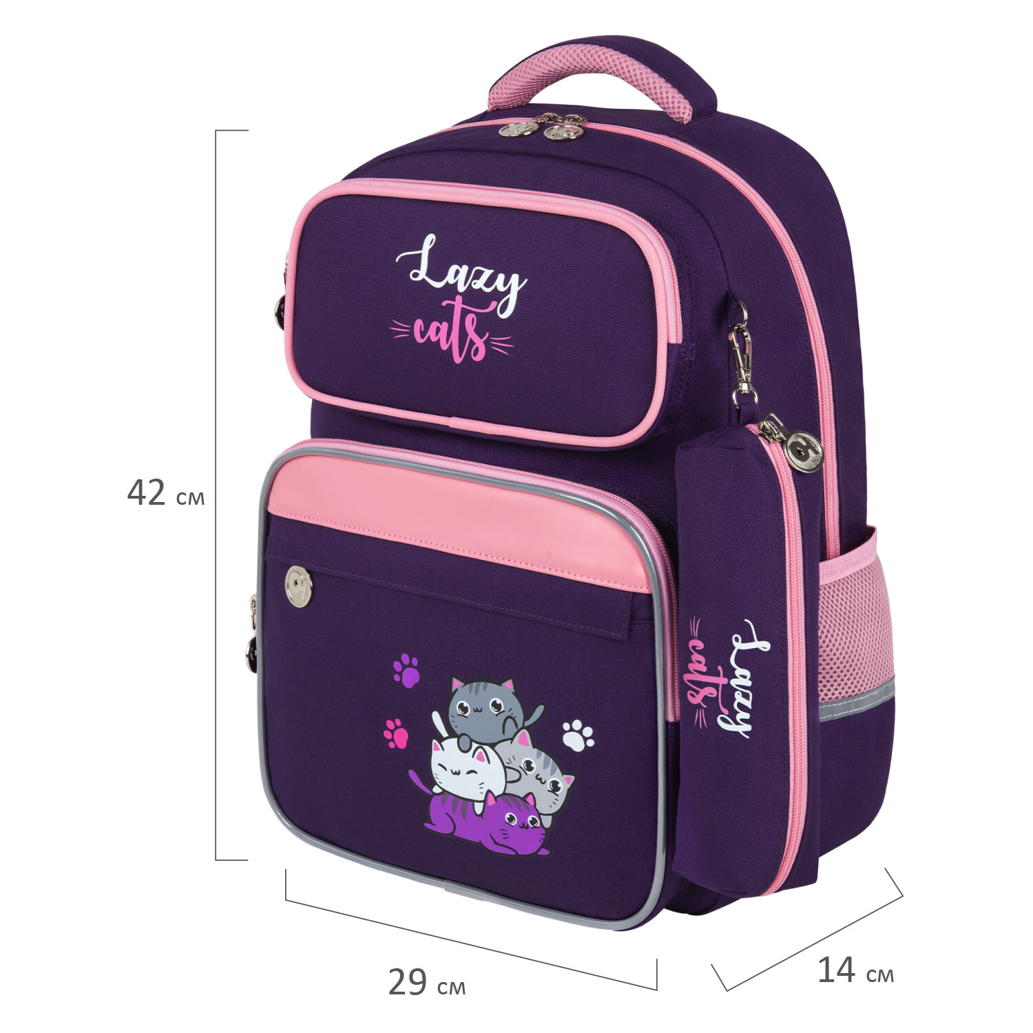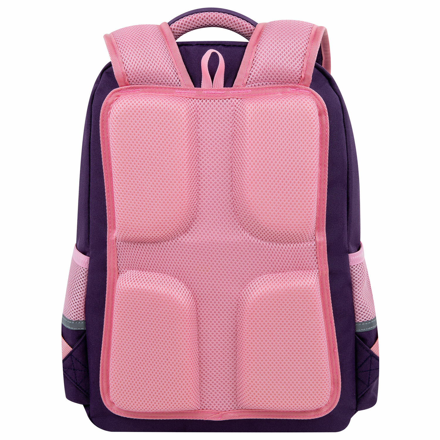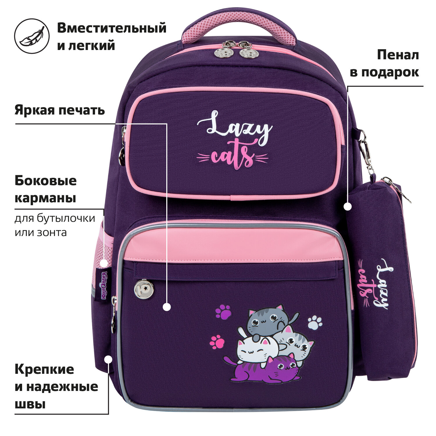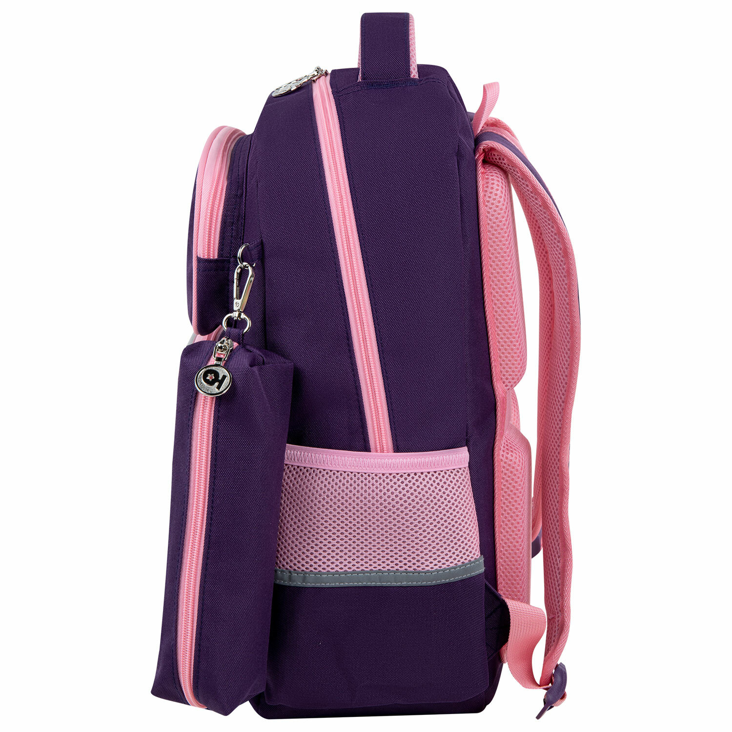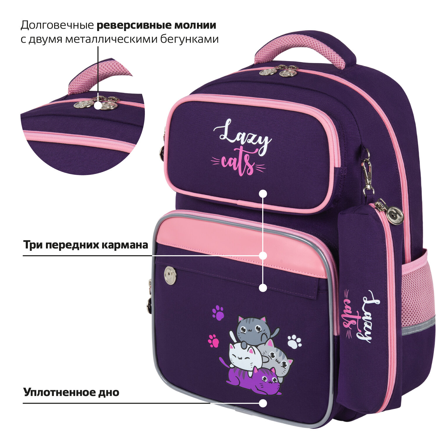 Рюкзак снабжен усиленной ручкой из ткани и петелькой для подвешивания на крючок, а также фиксатором для тетрадей. Светоотражающие элементы с четырех сторон обеспечивают безопасность в темное время суток.