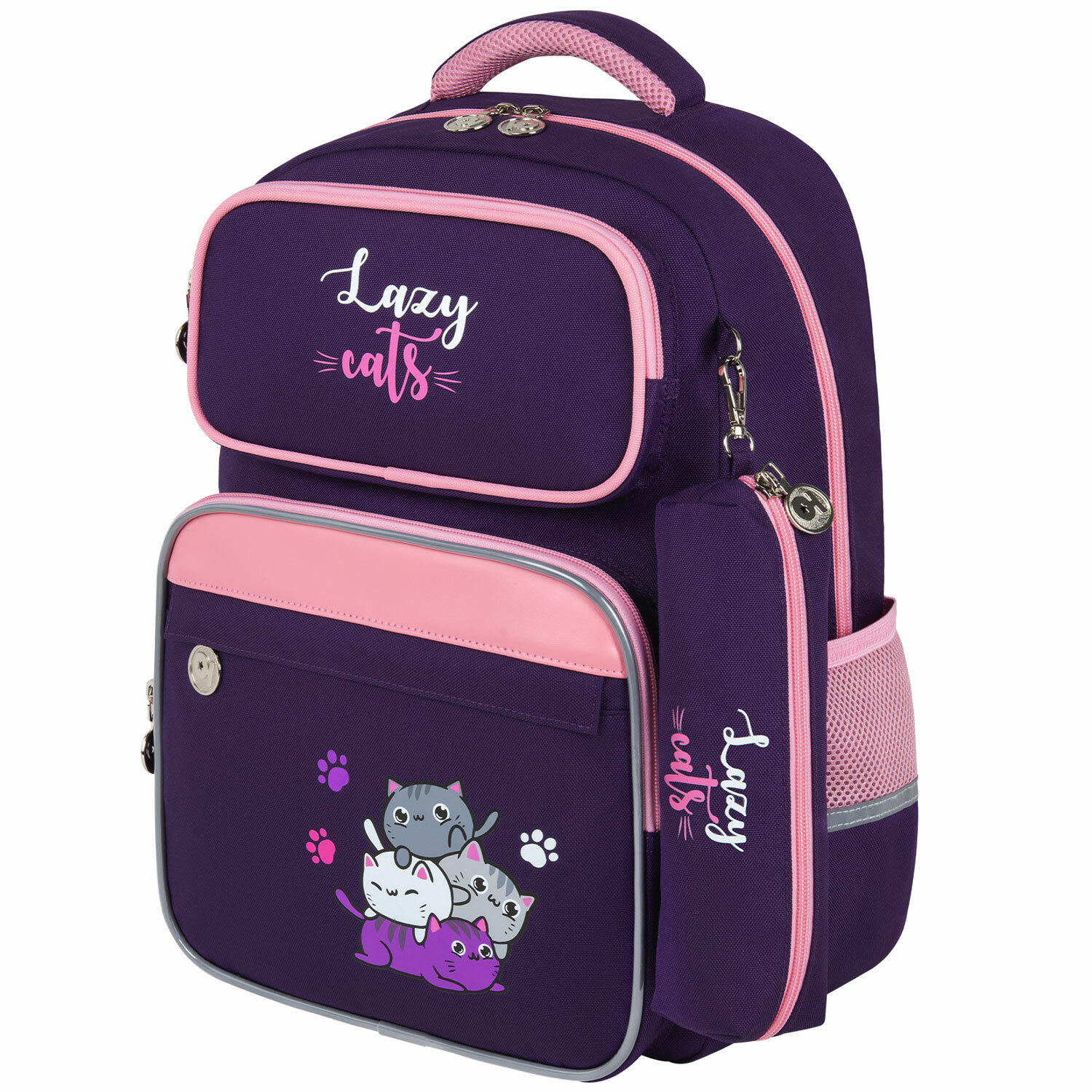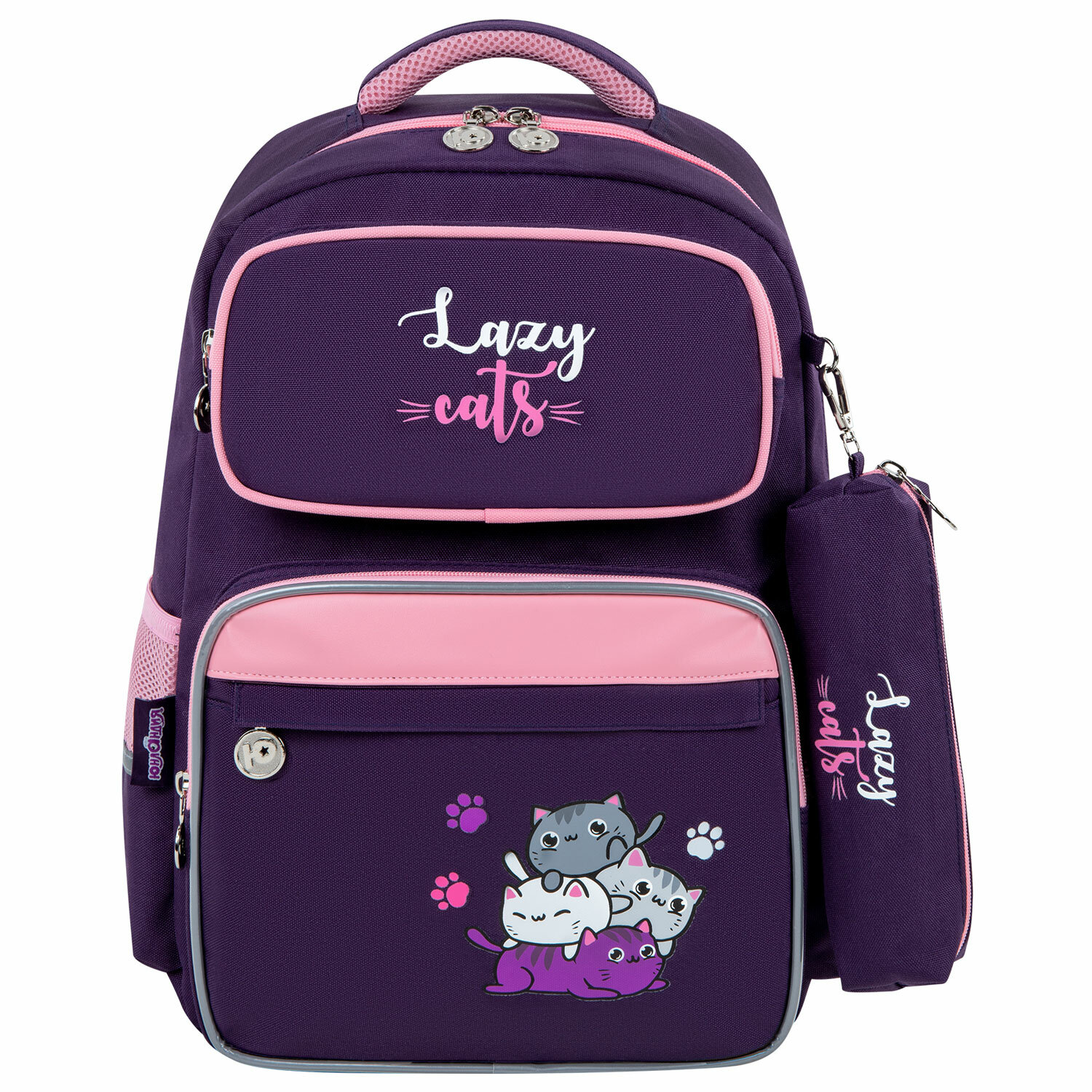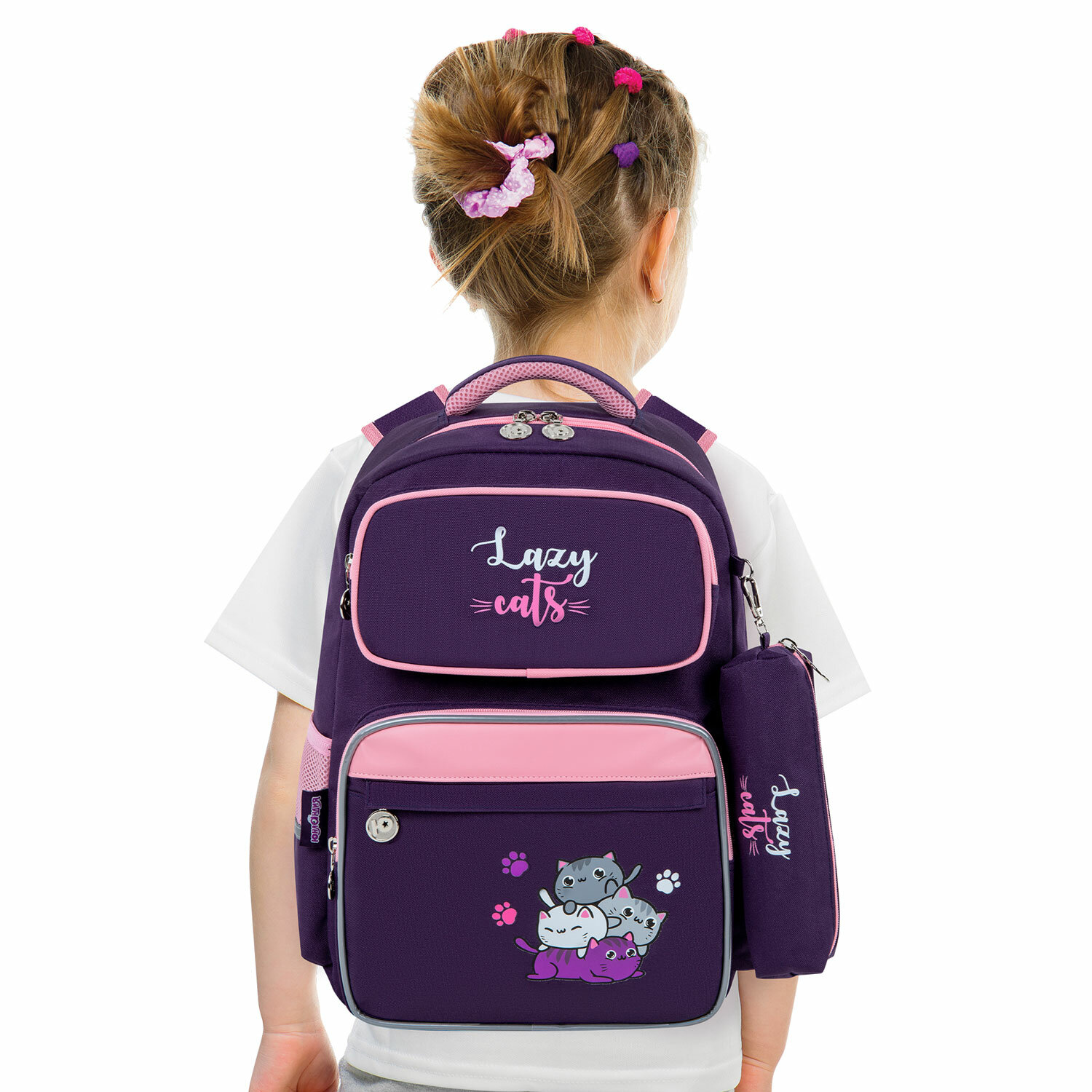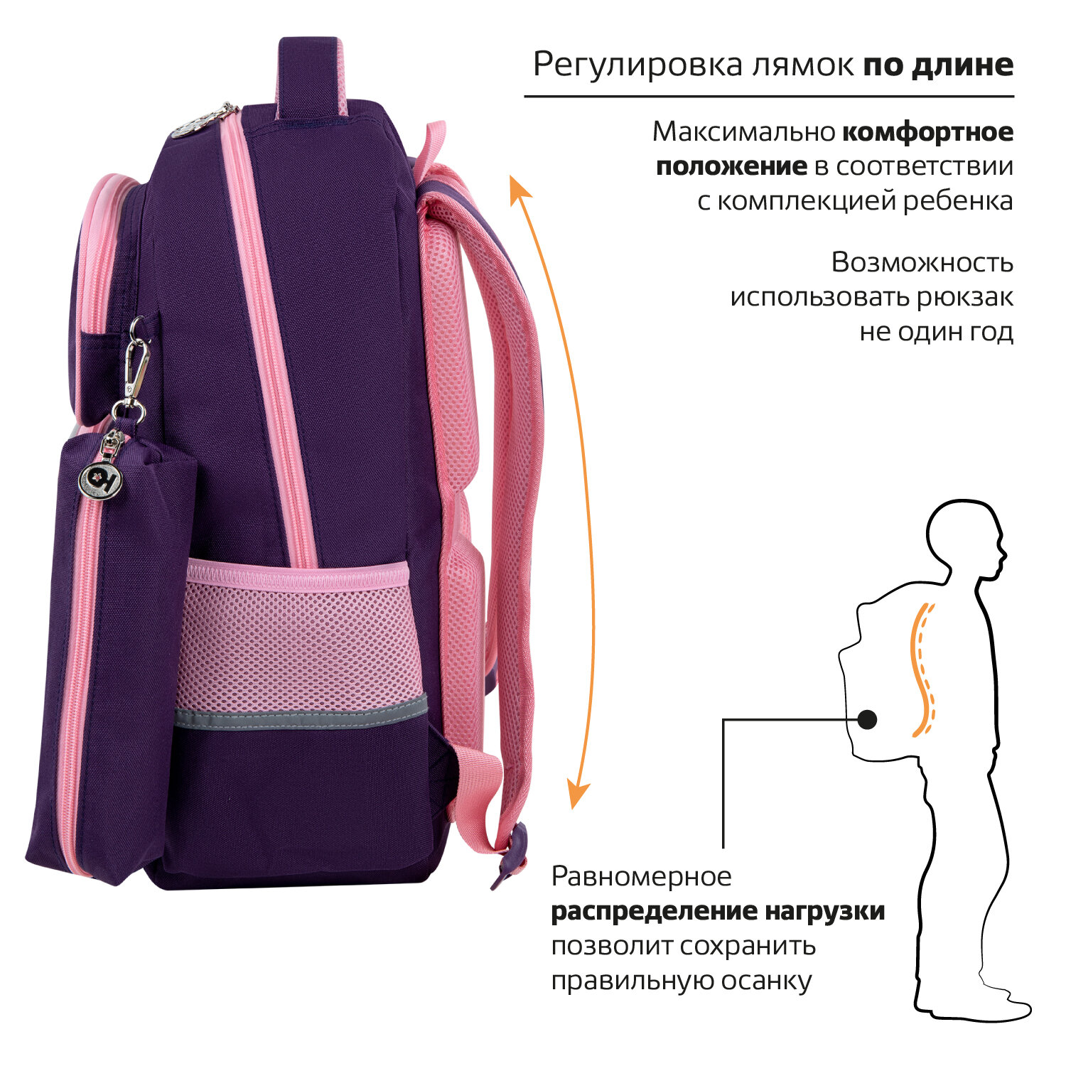 Рюкзак снабжен усиленной ручкой из ткани и петелькой для подвешивания на крючок, а также фиксатором для тетрадей. Светоотражающие элементы с четырех сторон обеспечивают безопасность в темное время суток.