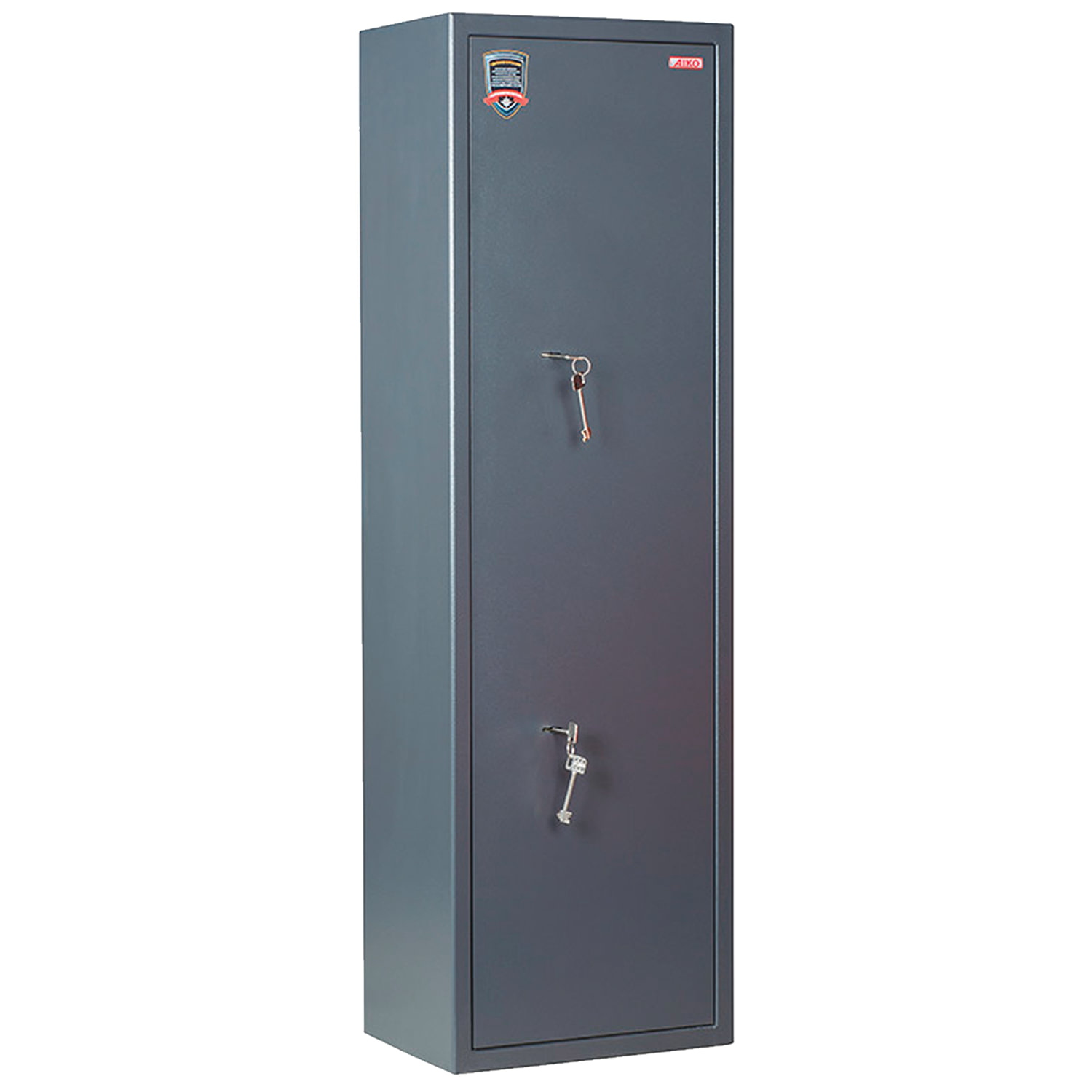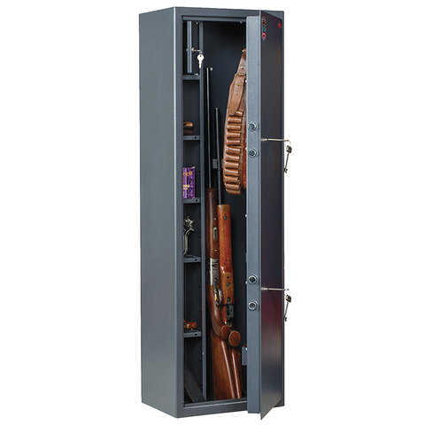 Для хранения 3 стволов. Размер внешний (ВхШхГ) - 1400x430x300 мм. Размер внутренний (ВхШхГ) - 1394x244x243 мм. Соответствуют (по заключению НИЦ «Охрана» МВД РФ) требованиям МВД РФ к хранению огнестрельного оружия. 2 ключевых замка. Патронное отделение (222х178х187мм) с замком, ложементы для ружей. 3 полки. Толщина металла корпуса и двери – 3 мм. Предусмотрено анкерное крепление к полу и стене. Цвет - графит структурированный. Тип покрытия - порошковое. Вес - 71 кг.