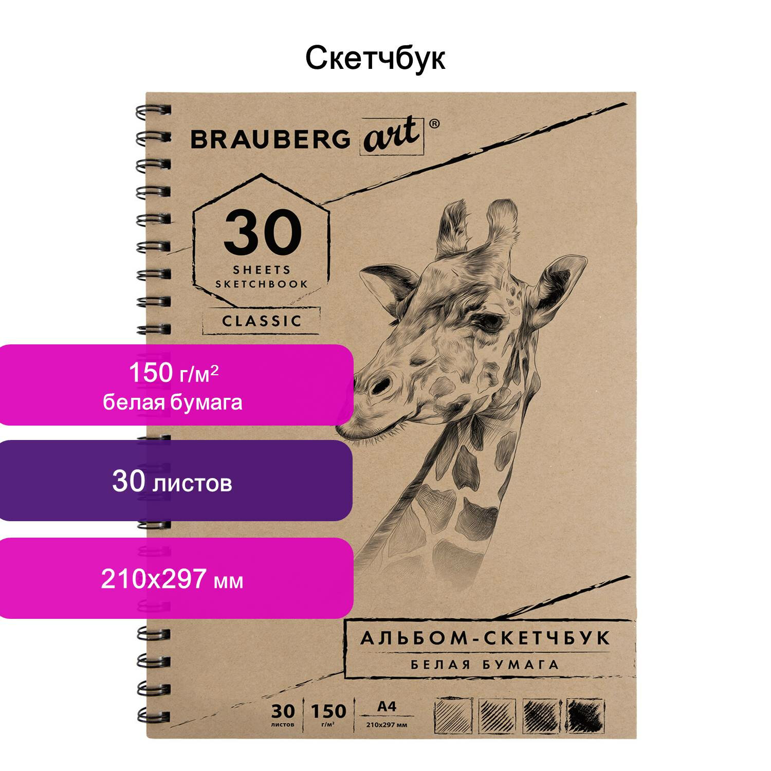 Тип товара: альбом (скетчбук) Серия: Classic Вид работ: для эскизов Количество листов: 30 Формат: А4 Ширина: 210 мм Длина: 297 мм Обложка: картонная Внутренний блок: художественная бумага Цвет внутреннего блока: белый Плотность внутреннего блока: 150 г/м2 Жесткая подложка: да Скрепление: гребень Без кислот: да