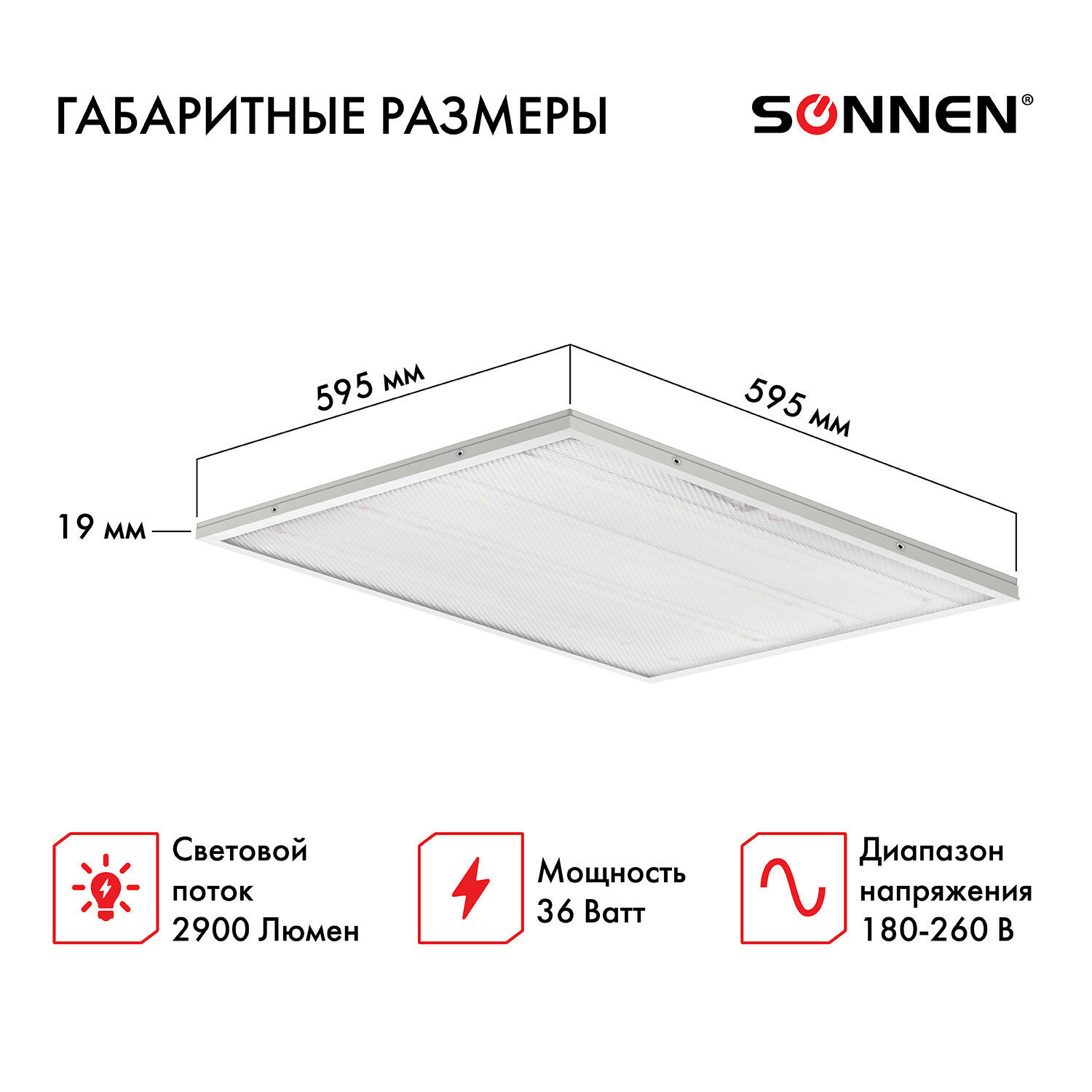 Прибор SONNEN освещает пространство со световым потоком, равным 2900 Лм, при цветовой температуре, составляющей 6500 К, благодаря чему подходит для обслуживания большого помещения. Его размеры составляют 595x19x595 мм.