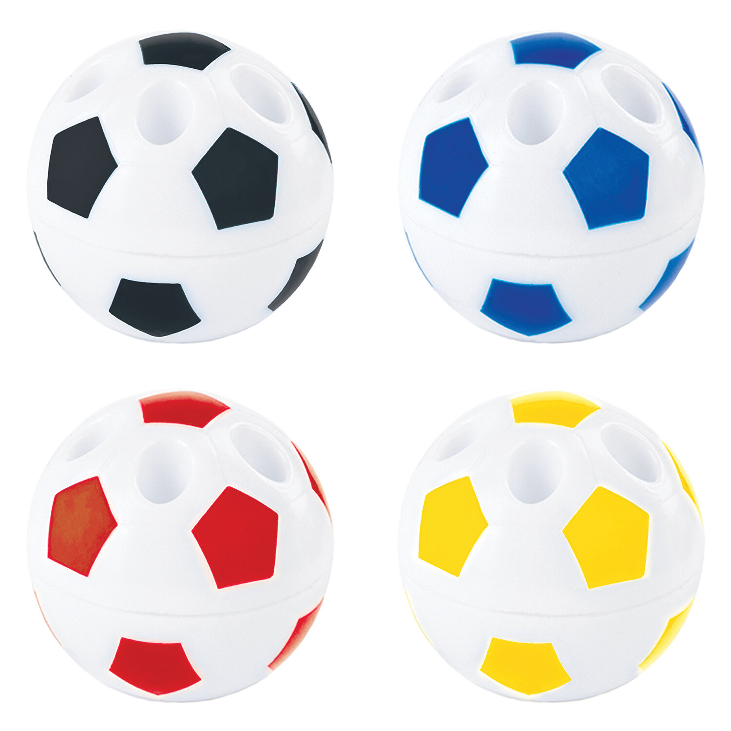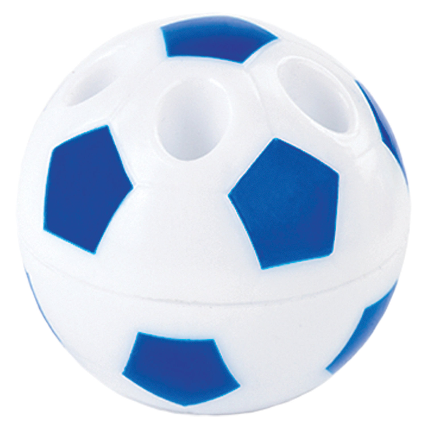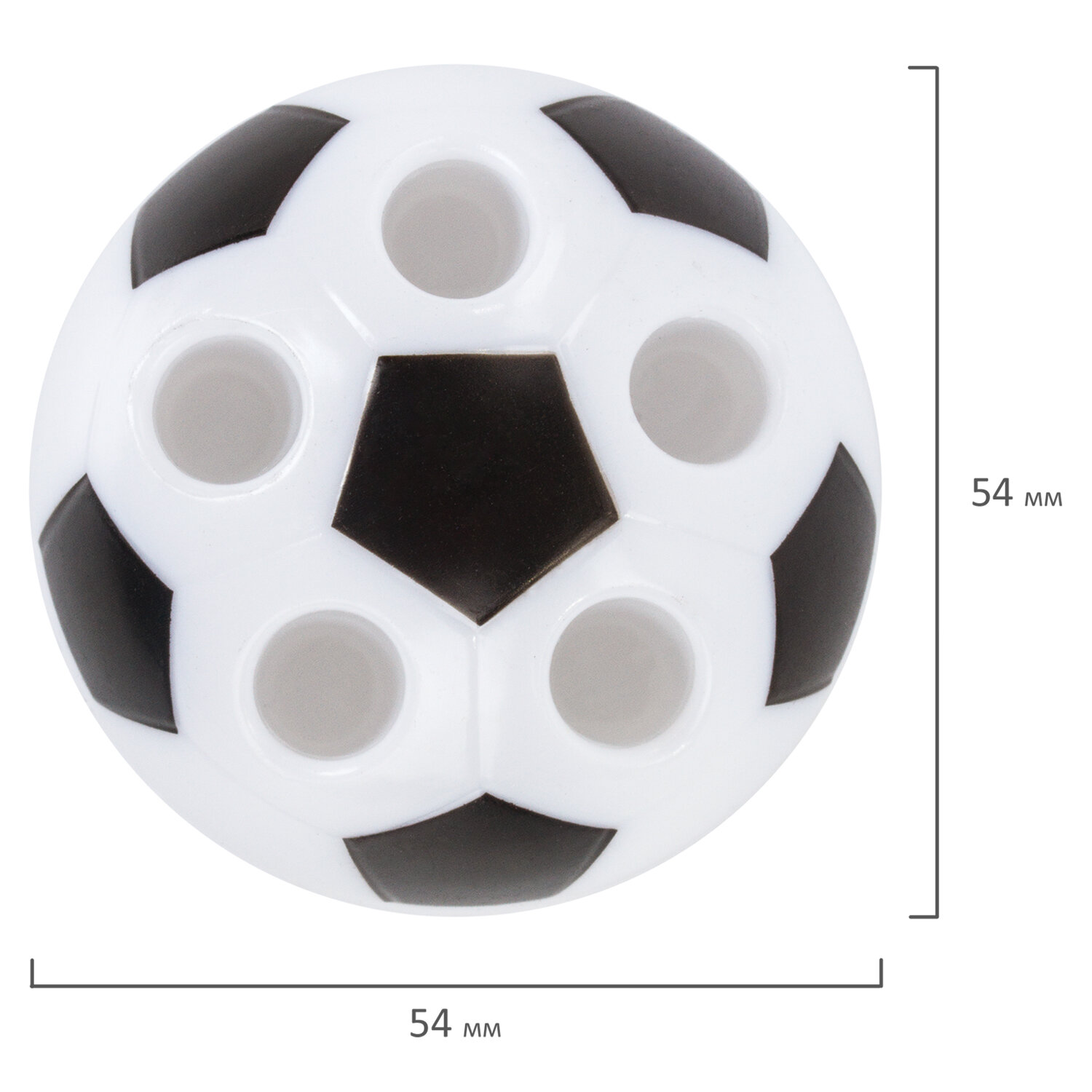 Эргономичный корпус в форме футбольного мяча выполнен из пластика. Точилку можно использовать как подставку под карандаши, для этого на корпусе имеется пять специальных отверстий. Острое стальное лезвие обеспечивает быструю и легкую заточку. Карандаш затачивается аккуратно, а опилки остаются в специальном контейнере. Размер: 51х54х54 мм.
