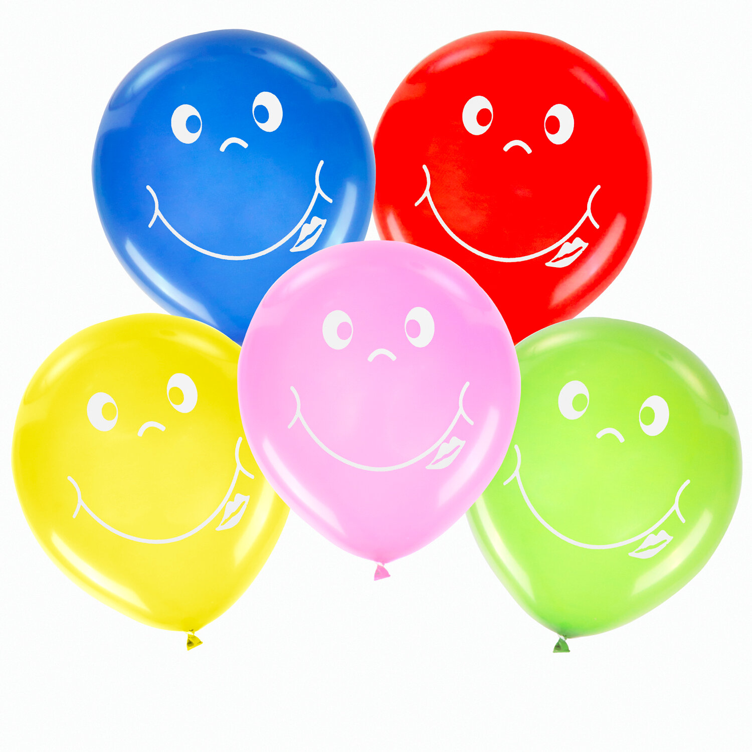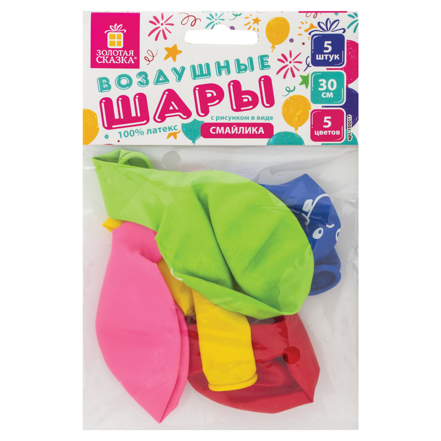 Тип товара: шары Вид: классический Размер: 30 см Количество в комплекте: 5 шт. Количество цветов: 5 Рисунок: "Смайл" Количество рисунков: 1 Материал: латекс Цвет: ассорти Упаковка: пакет с европодвесом