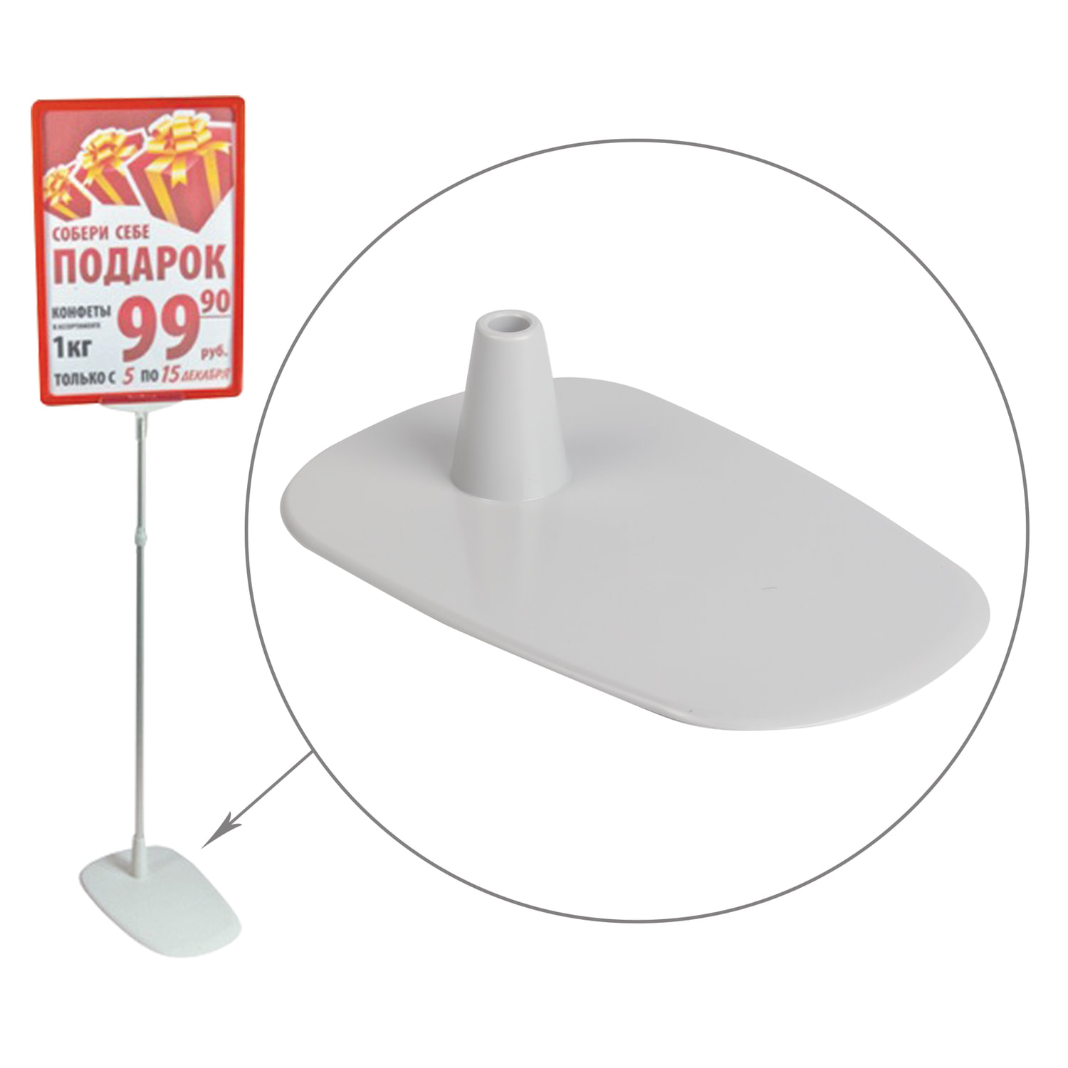 Тип товара: подставка Назначение: напольная подставка Тип крепления рамки: вертикальная установка Количество в комплекте: 1 шт Материал: пластик Ширина: 145 мм Высота: 58 мм Диаметр трубки: 9 мм Цвет: серый
