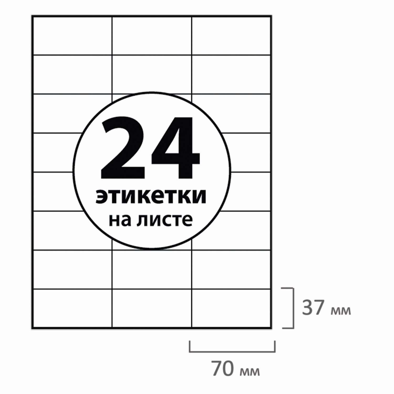 Назначение: универсальное Количество этикеток на листе: 24 шт. Длина этикетки: 70 мм Ширина этикетки: 37 мм Форма: прямоугольная Количество листов в упаковке: 100 шт. Технология печати: для лазерной печати, для струйной печати Плотность: 70 г/м2 Тип поверхности: матовая Цвет этикетки: белый Спецэффект цвета: нет Шаблон для скачивания: да