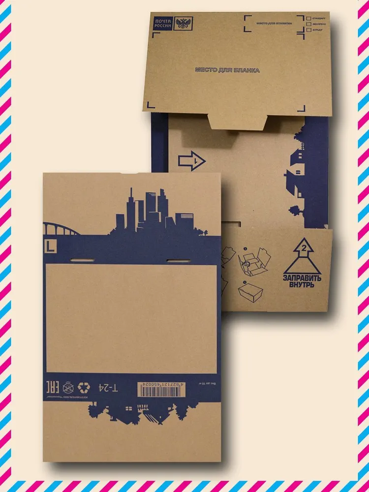 Коробка поставляется в виде выкройки и очень просто собирается, причем для сборки не требуется использовать ни клей, ни клейкая лента. Достаточно только вставить клапаны крышки в специально оставленные прорези – и коробка готова. Она способна выдерживать довольно большую нагрузку, но чтобы содержимое посылки не перемещалось внутри коробки, рекомендуется его обкладывать мятой бумагой. Упакованная коробка укрепляется при помощи клейкой ленты.