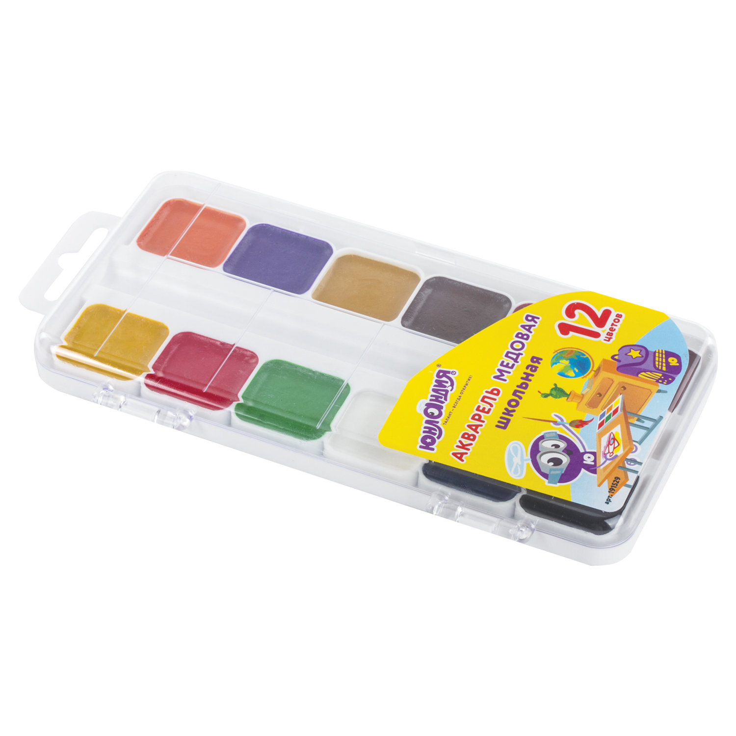 Количество цветов в наборе: 12 Серия: Школьные Добавка в основу: мед Отделение для кисточки: да Форма кюветов: квадратная Упаковка: пластиковая коробка