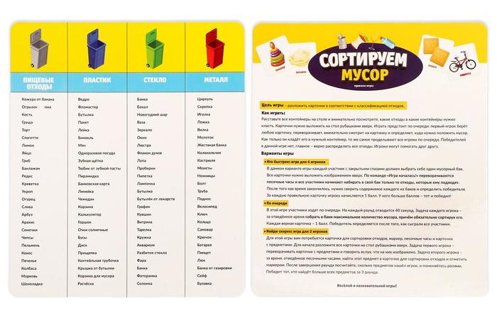 Игра рассчитана на двух участников. Вам потребуется карточка для сортировки отходов, маркер, песочные часы и карточки с предметами. Первый игрок произносит вслух, что изображено на карточках. Второй игрок за отведённое время находит этот предмет в карточке отходов и обводит его маркером. После завершения раунда посчитайте, сколько предметов нашёл участник, и поменяйтесь ролями. Победит тот, кто больше всех предметов найдёт за 3 раунда.