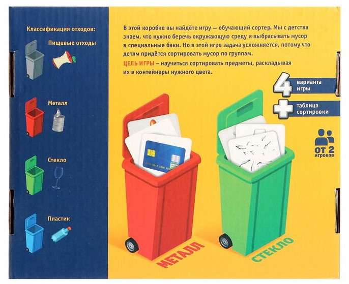 Игра рассчитана на четырёх участников. Каждый выбирает себе мусорный бак и на скорость отбирает только те отходы, которые ему подходят. По истечении времени необходимо сверить содержимое каждого из баков и определить победителя. За каждую правильную карточку игрок получает 1 балл.
