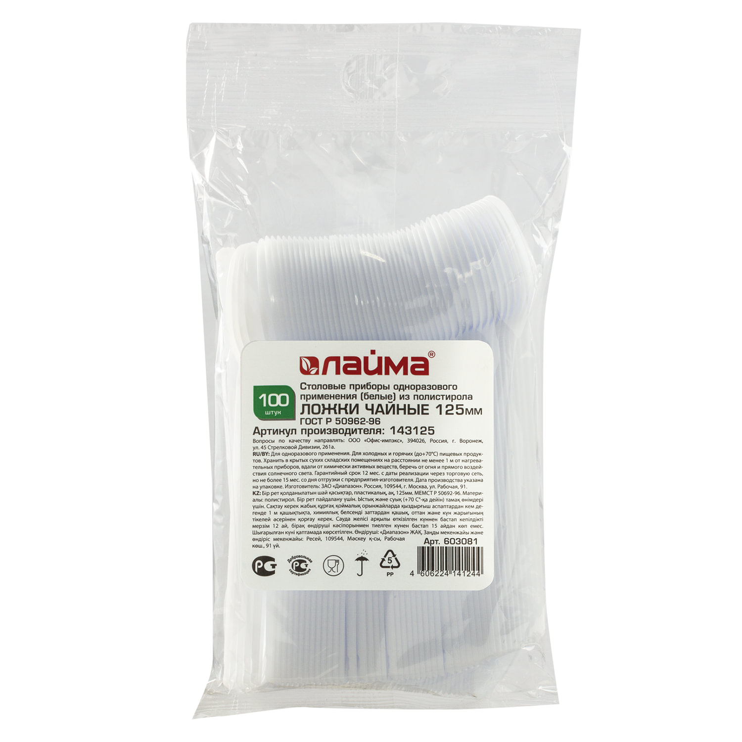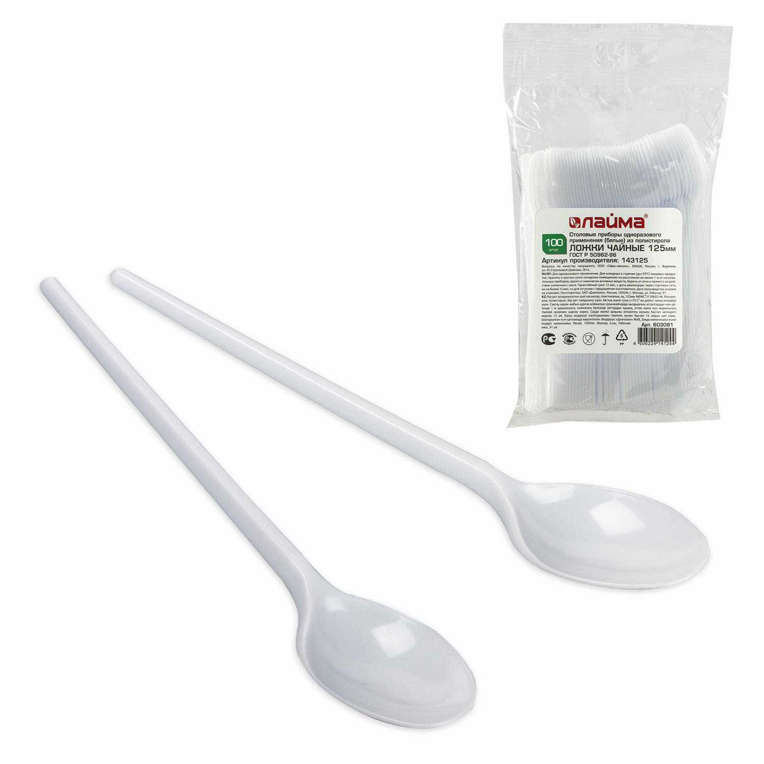 Тип товара: ложка чайная Назначение: для горячего Длина: 125 мм Соответствует требованиям ГОСТа: ГОСТ Р 50962-96 Материал: полистирол Количество в упаковке: 100 Цвет: белый Компакт-упаковка: да