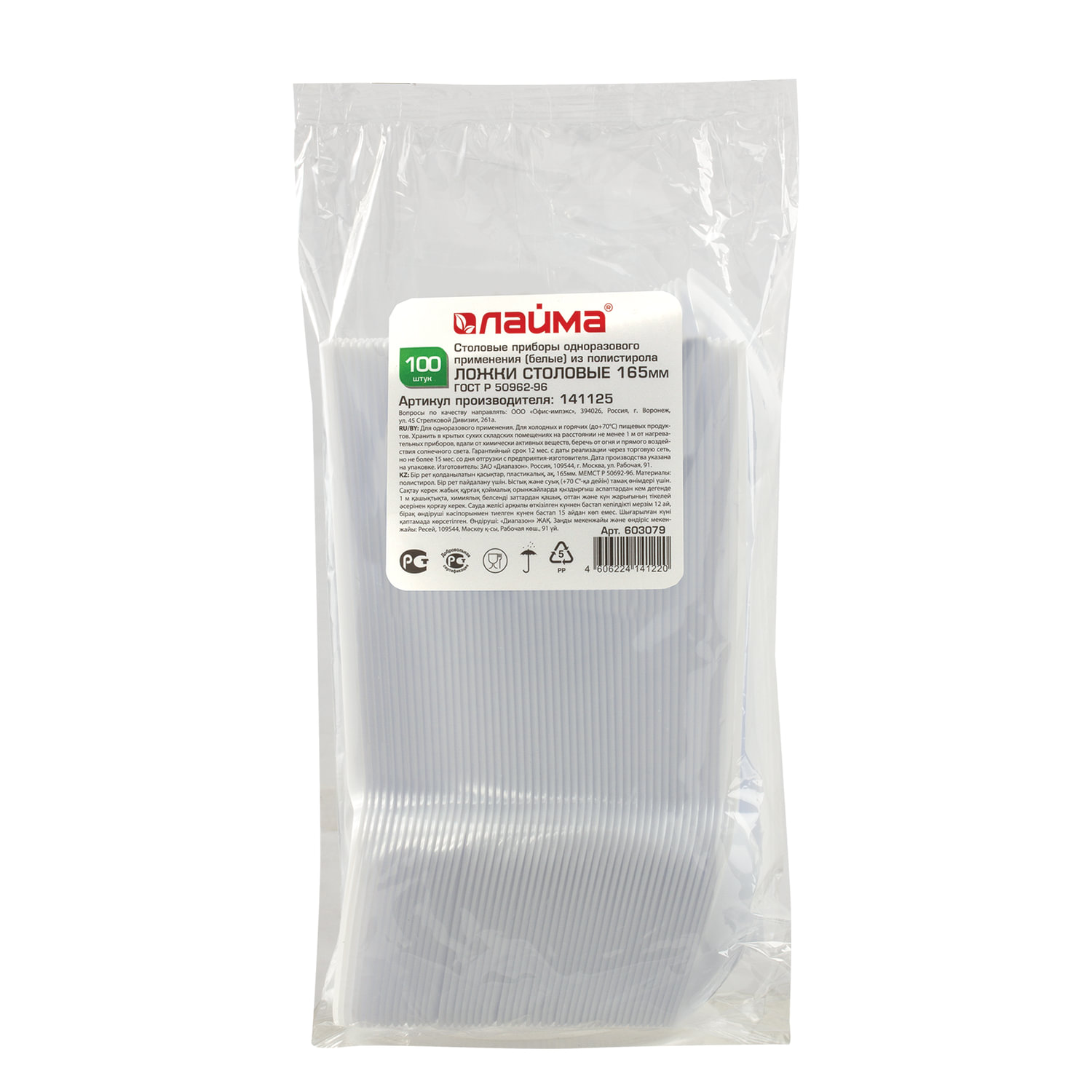 Тип товара: ложка столовая Назначение: для горячего Длина: 165 мм Соответствует требованиям ГОСТа: ГОСТ Р 50962-96 Материал: полистирол Количество в упаковке: 100 Цвет: белый Компакт-упаковка: да