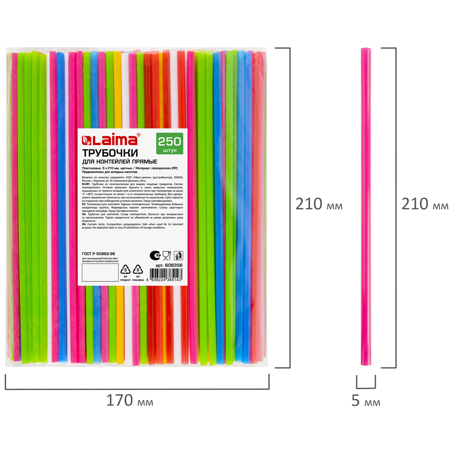 Трубочки диаметром 5 мм идеальны для подачи воды, сока, морса, лимонада, холодного чая и кофе, алкогольных и безалкогольных коктейлей и других напитков. Коктейльные трубочки - неотъемлемый аксессуар любого фуршета, пикника, детского праздника или домашней вечеринки. Материал: полипропилен. Длина трубочки 210 мм, поставляются в комплекте 250 штук. Упаковка - полипропиленовый пакет.