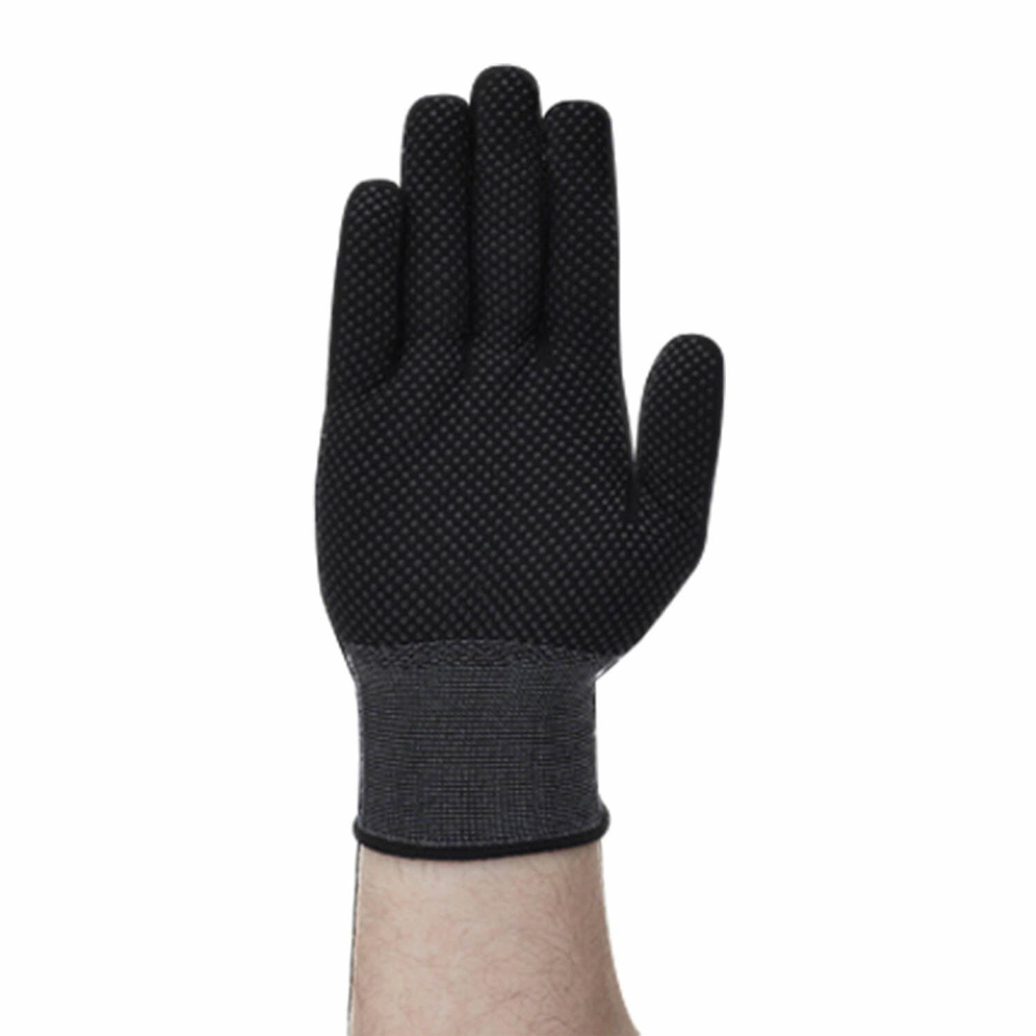 Нейлоновые перчатки черного цвета с нанесённой мягкой и цепкой ПВХ микроточкой.