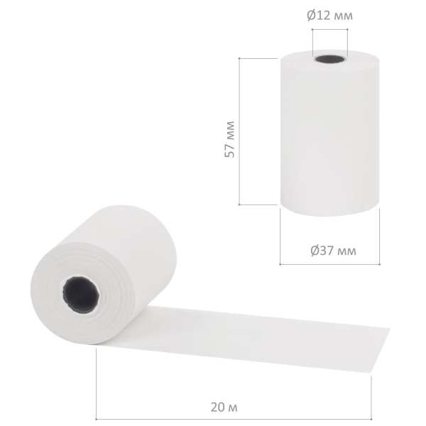 Ширина рулона: 57 мм Диаметр рулона: 37 мм Длина намотки: 20 м Диаметр втулки: 12 мм Плотность бумаги: 48 г/м2 Термослой: наружу Наличие сигнальной полосы: да Цвет печати: черный Количество в комплекте: 20 шт Упаковка: термоусадочная пленка
