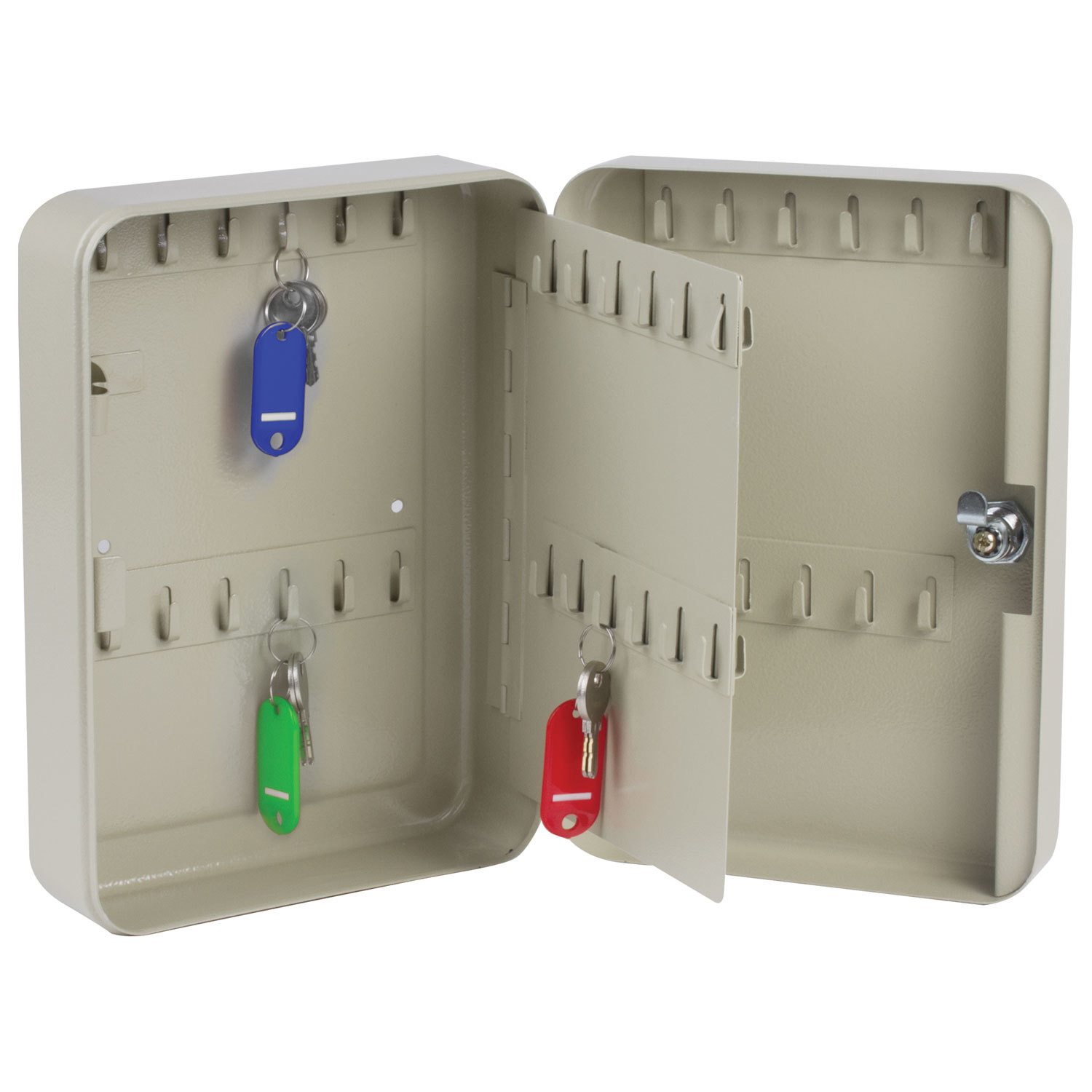 Количество размещаемых ключей: 48 шт Количество брелоков, входящих в комплект: 48 Дополнительная комплектация: 2 ключа от замка, шурупы для крепления на стене Закрывается на замок: да Материал корпуса: сталь толщиной 0,8 мм Высота: 250 мм Ширина: 180 мм Глубина: 80 мм Цвет: серый