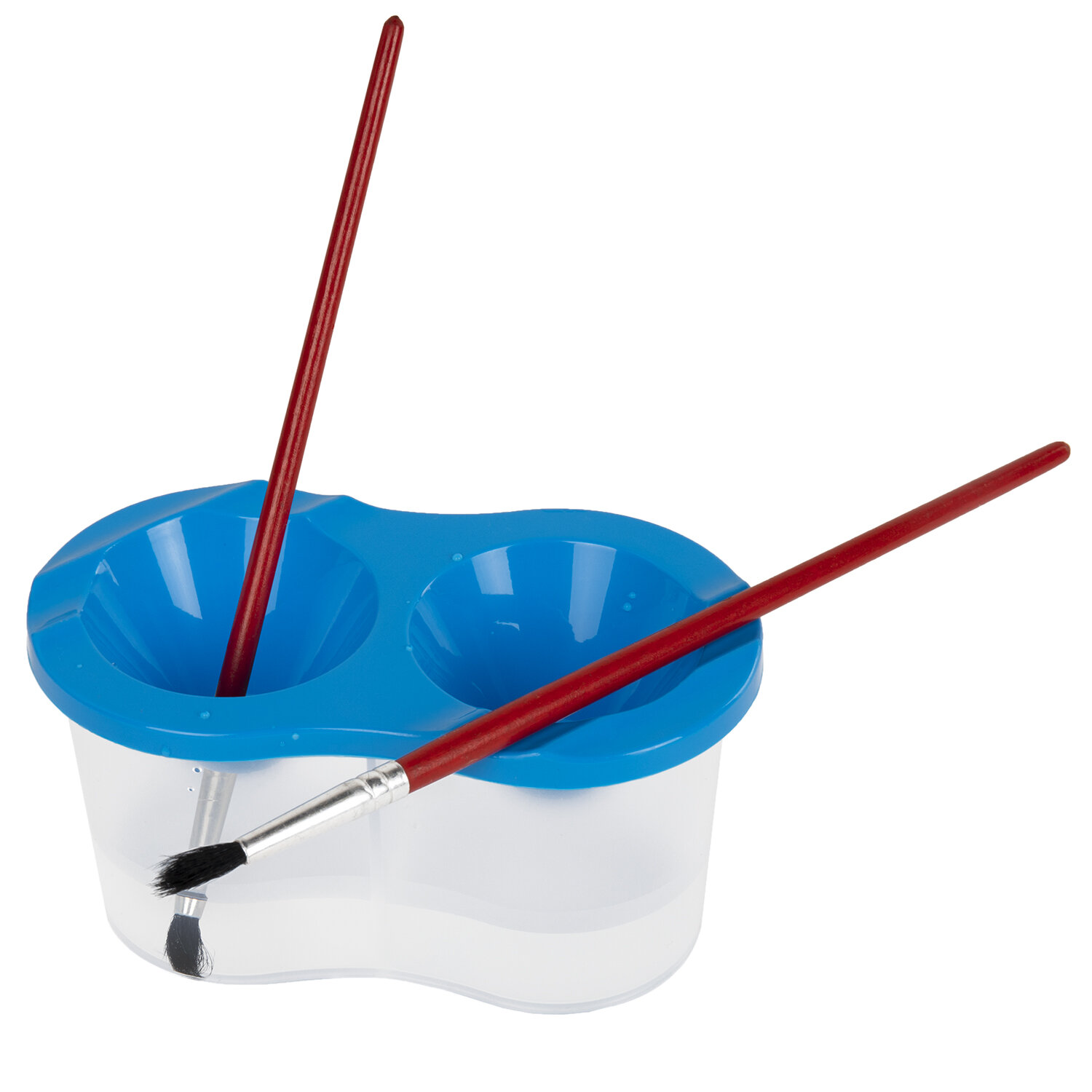 Стакан выполнен из прочного пластика и имеет 2 вместительных резервуара для воды. Линия на прозрачном корпусе указывает на максимально возможный уровень наполнения. Специальная форма крышки стакана исключает возможность вытекания воды. На крышке имеются углубления для размещения кисточек. Полный объем одного отделения - 150 мл. Объем до уровня наполнения - 50 мл.